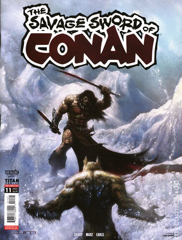 (W) Liam Sharp, Ron Marz (A) Liam Sharp, Danny Earls (CA) Liam Sharp THE SAVAGE SWORD OF CONAN CONTINUES ITS RELENTLESS RAMPAGE FROM TITAN COMICS AND HEROIC SIGNATURES! Featuring writer/artist Liam Sharps triumphant return to the Hyborian Age with a spellbinding CONAN epic, the debut of Robert E. Howards CORMAC MAC ART brought to life by writer Ron Marz and artist Danny Earls, colossal covers from Alex Horley and Liam Sharp, an array of astonishing pin-ups, and more, SAVAGE SWORD OF CONAN Issue #11 lays siege to comic shop shelves this October! 64 pages, full color, rated mature. Cover price $6.99.