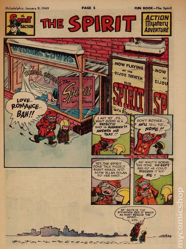 January 9, 1949. Spirit Weekly Newspaper section. Scripts by Eisner or Feiffer, or Eisner/Feiffer, or Nordling. Art by Eisner with backgrounds by Eisner, Grandenetti, Le Blanc, Stallman, Nordling, Dixon and/or others except where noted. Tabloid Sized Newsprint, 10-3/4" x 15", 8 pages, full color.