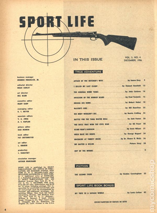 View scansVolume 3, Issue 4 - December 1956. Cover by Rafael De Soto. Men's interest magazine focusing on hunting, fishing, and fitness articles. 8 1/2-in. x 11-in., 98 pages, B&W Cover price $0.35.