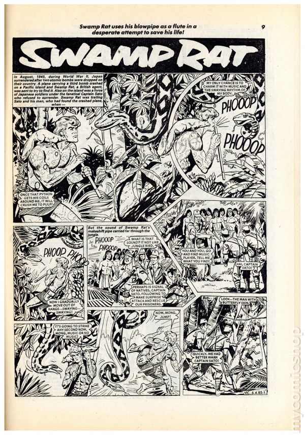 April 6, 1985. Published by D.C. Thompson and Co. Ltd. in Great Britain. Action/adventure stories feature the Quest of the Last Six Hundred, Johnny Gurkha, the Punch Pirate, Morgyn the Mighty, Legion of the Lost, Duke Farlow, Taneebo the Thunderbolt, and more. 8.5 x 11.75; black and white; 32 pages; 18p cover price.