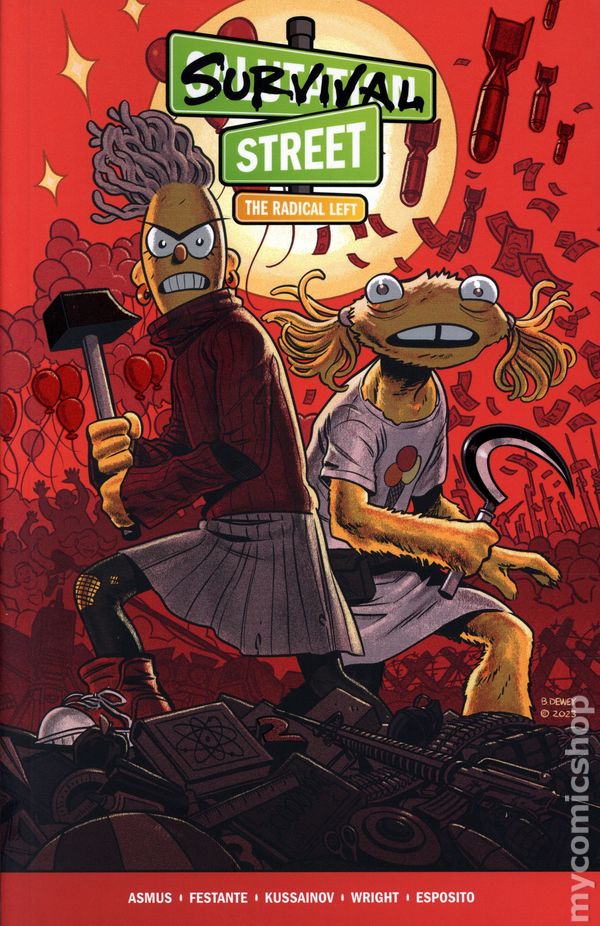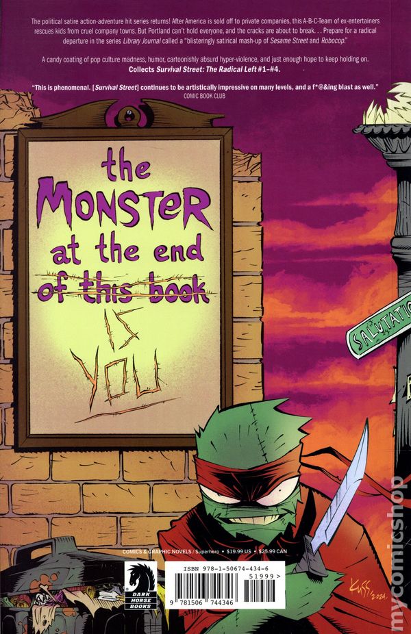 Volume 2 - 1st printing. "The Radical Left!" Collects Survival Street: The Radical Left (2024 Dark Horse) #1-4. Written by James Asmus and Jim Festante. Art by Abylay Kussainov. Cover by Benjamin Dewey. Back Cover by Abylay Kussainov. The political satire action-adventure hit series returns! After America is sold off to private companies, this A-B-C-Team of ex-entertainers rescues kids from cruel company towns. But Portland can't hold everyone, and the cracks are about to break... A candy coating of pop culture madness, humor, cartoonishly absurd hyper-violence, and just enough hope to keep holding on. Softcover, 112 pages, full color. Cover price $19.99.