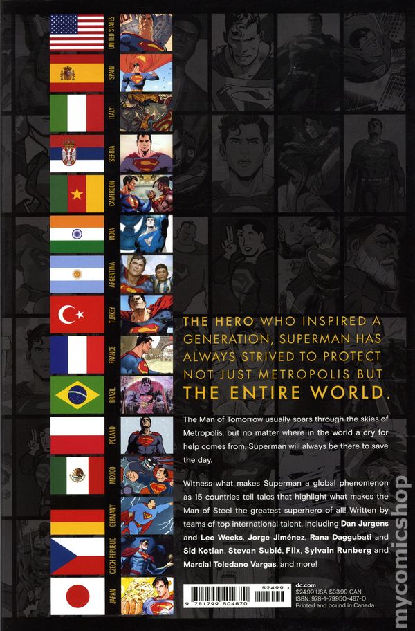 1st printing. Written by Ethem Onur Bilgic, Jefferson Costa, Rana Daggubati, Bernardo Fernandez, Flix, Dr. Ejob Gaius, Jorge Jimenez, Dan Jurgens, Stepan Kopriva, Mauro Mantella, Satoshi Miyagawa, Marco Nucci, Sylvain Runberg, Stevan Subic, and Bartosz Sztybor. Art by Agustin Alessio, Ethem Onur Bilgic, Fabio Celoni, Jefferson Costa, En Ejob, Bernardo Fernandez, Flix, Jorge Jimenez, Kai Kitago, Sid Kotian, Marek Oleksicki, Stevan Subic, Michal Suchanek, Marcial Toledano Vargas, and Lee Weeks. Cover by Lee Weeks. EXPERIENCE SUPERMAN BEYOND METROPOLIS! The hero who inspired a generation, Superman, has always strived to protect not just Metropolis but the entire world. The Man of Tomorrow usually soars through the skies in Metropolis, but no matter where in the world a cry for help comes, Superman will always be there to save the day. Witness what makes Superman a global phenomenon as 15 countries tell tales that highlight what makes the Man of Steel the greatest superhero of all! Written by teams of top international talent, including Dan Jurgens and Lee Weeks (U.S. storyline)! Hardcover, 184 pages, full color. Cover price $24.99.