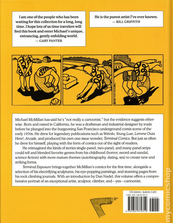1st printing. Story and art by Michael McMillan. Michael McMillan has said he's "not really a cartoonist," but the evidence suggests otherwise. Born and raised in California, he studied architecture and design before a visit in 1969 to an exhibition of Chicago's Hairy Who and encounters with the bourgeoning San Francisco underground comix scene convinced McMillan to make his own comics. He plunged in, drawing for legendary publications like Weirdo, Young Lust, Lemme Out Here, Arcade, and eventually his own one-issue wonder, Terminal. Over the following decades, McMillian kept playing with the form of comics. He reimagined the kind of stories single-panel, two-panel, and many-panel strips could tell, blending favorite genres from his childhood (horror, swords and sandals, science fiction) with more mature themes (autobiography, dating, sex) into new and striking forms. McMillan's comics are collected here for the first time, alongside a selection of his electrifying sculptures, eye-popping paintings, and stunning pages from the journals he kept during his years rock climbing in California's Sierra Nevada. Hardcover, 8-in. x 9-in., 200 pages, B&W. Cover price $39.95.