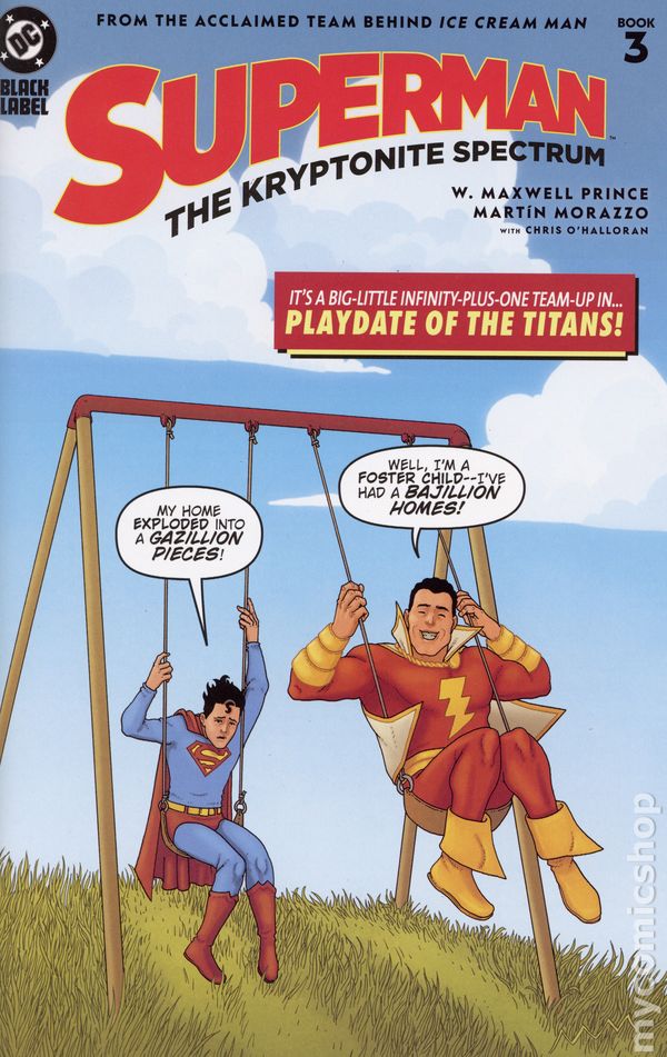 (W) W. Maxwell Prince (A) Martin Morazzo (CA) Martin Morazzo W. MAXWELL PRINCE AND MARTIN MORAZZO TAKE SUPERMAN TO EVEN WEIRDER HEIGHTS! Superboy and Captain Marvel ride the rickety roller coaster (literally!) through the many-hued amusement park of motley meteoroids that is the Kryptonite Spectrum! With Superman now a bit...shorter in the tooth...the Boy of Yesterday must team up with a truly Marvelous friend in a story for the ages...for all ages! What, exactly, is Nostalgia Springs? And what do Toyman and Sivana have to do with it? Find out in this great adventure--chock-full of crayons, Kryptonites, and a cruise through comics chronology! Full color, 32 pages, Not Rated. Cover price $5.99.