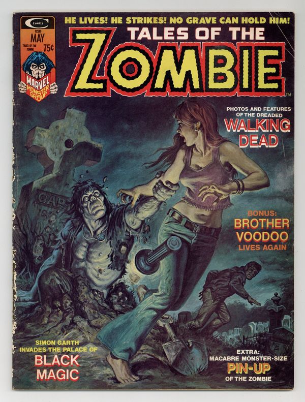 Simon Garth dies but is brought back to life as a zombie and doomed to walk the earth as one of the living dead. In a three part story, "Alter of the Damned" (Script by Steve Gerber and Roy Thomas and art by John Buscema and Tom Palmer), "Zombie" (Script by Stan Lee and art by Bill Everett) and "Night of the Walking Dead" ) Script by Steve Gerber and art by John Buscema and Syd Shores) a former employee's revenge seals Garth's fate into becoming a zombie but he still fights to protect his daughter. Issue also has "Iron Head (Script by Stan Lee, art by Dick Ayers), an article about the zombie in the movies, "The Thing from the Bog" (script by Kit Pearson and Marv Wolfman and art by Pablos Marcos), and "Mastermind" (script and art by Tom Sutton). All stories are in black and white. Cover price $0.75.