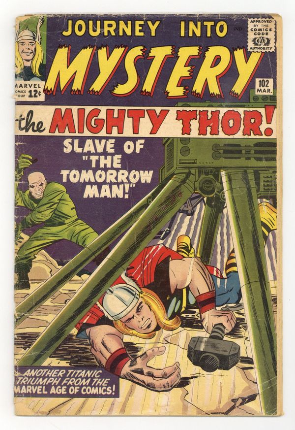 Cover pencils by Jack Kirby, inks by Sol Brodsky. Loki and the Tomorrow Man seek to make Thor's life miserable in "Slave of Zarrko, the Tomorrow Man!", script by Stan Lee, pencils by Jack Kirby, inks by Chic Stone; Thor helps Zarrko conquer the 23rd century world, but then turns on him and defeats him, winning back Odin's favor. "The Green Hat" text story. "The Menace!", script by Stan Lee (plot) and Larry Lieber (script), pencils by Larry Lieber, inks by Matt Fox; An alien lands in a central European village and restrains the villagers while he sets up a weapon; He uses the weapon to drive back an attacking space fleet, and the villagers realize he was actually trying to help them. The first appearance of Heimdall's sister Sif (though with blonde hair) is in the "Tales of Asgard" back-up, "Death Comes to Thor!", script by Stan Lee, pencils by Jack Kirby, inks by Paul Reinman; Thor rescues Sif from Hela, goddess of Death, and earns the right to carry the Hammer of Odin; The story features young Thor, plus the first appearance of Hela, Goddess of Death, and the three Fates. 36 pgs., full color. Cover price $0.12.