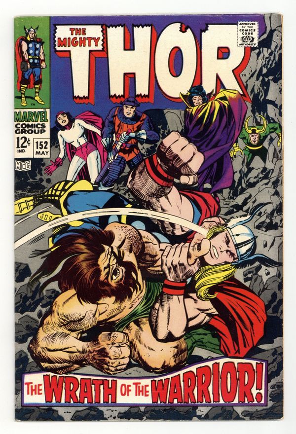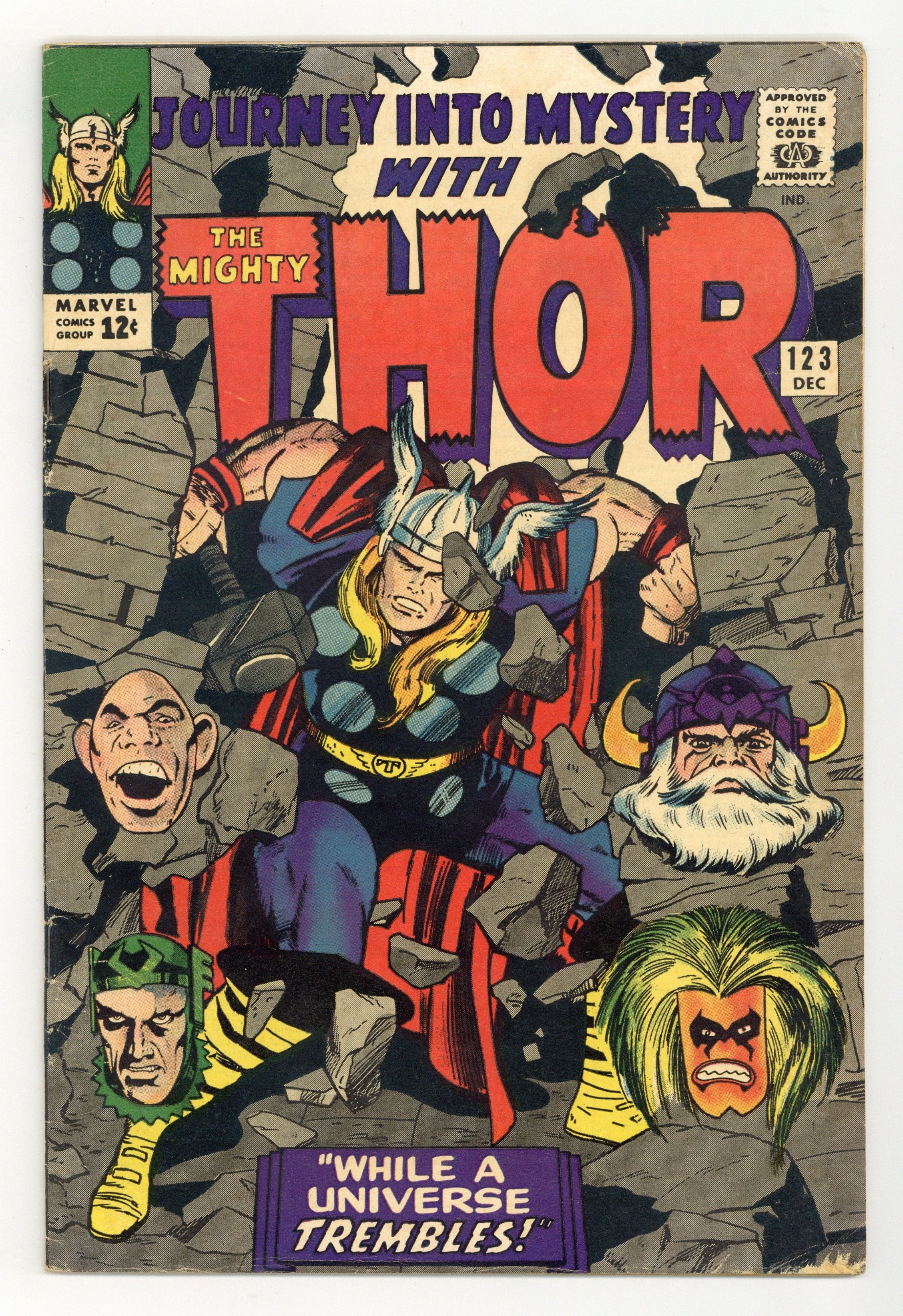 Cover pencils by Jack Kirby, inks by Vince Colletta. "While a Universe Trembles!", script by Stan Lee, pencils by Jack Kirby, inks by Vince Colletta; In order to keep the reporter from revealing his secret identity, Thor takes him to Asgard allowing him to witness The Absorbing Man's battle with Odin; On Earth, one of the Norn Stones has fallen into the hands of a witch doctor, transforming him into a powerful being. Fantastic Four ad. Marvel Bullpen Bulletins. Tale of Asgard: "The Jaws of the Dragon!", script by Stan Lee, pencils by Jack Kirby, inks by Vince Colletta; The Asgardian mission to stop Ragnarok runs into danger at the Pillars of Utgard where they must face a great stone dragon! Ad for Marvel Comics Group Official Swingin' Stationery, Thor T-Shirt, and Spider-Man Poster. 36 pgs., full color. $0.12. Cover price $0.12.