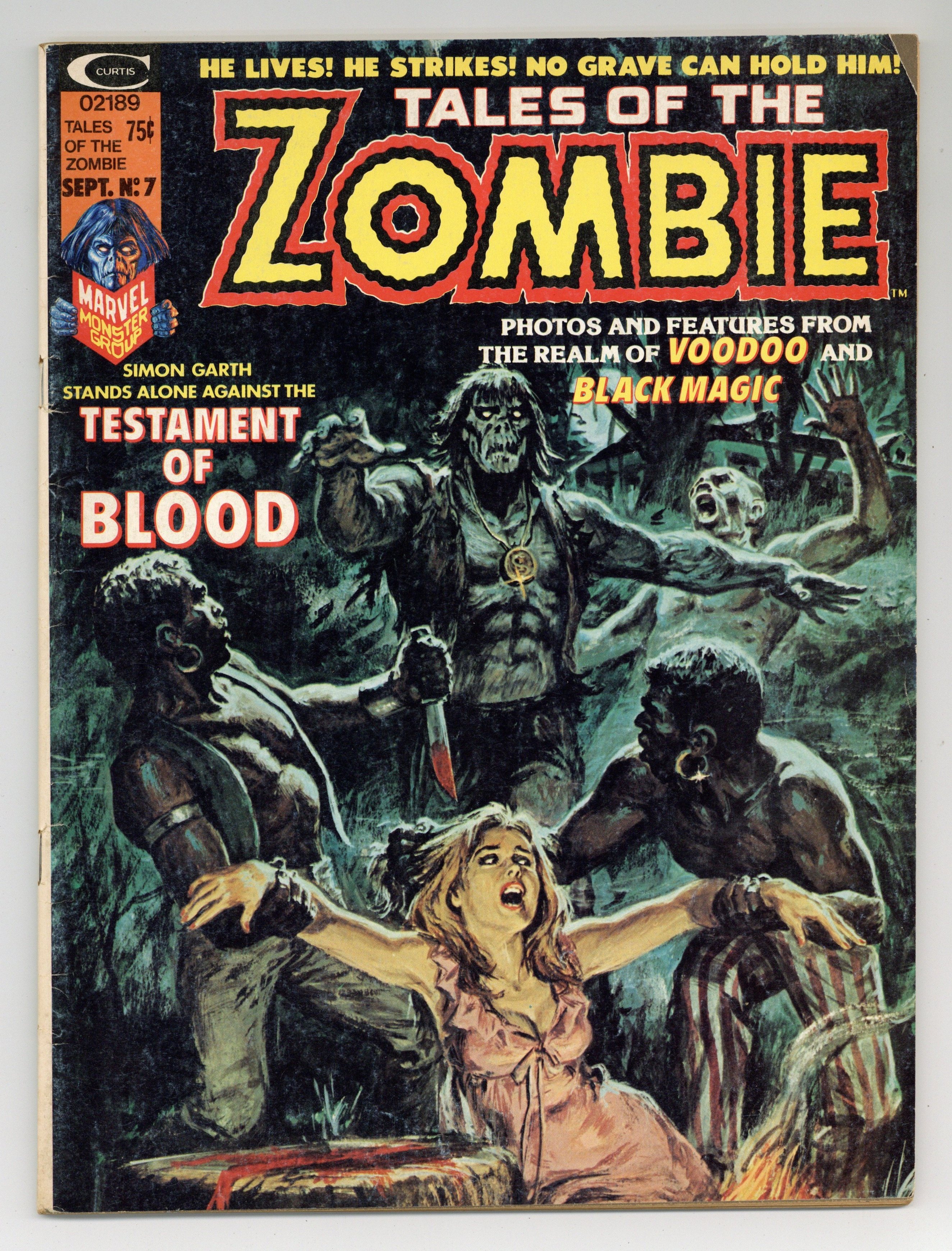 Simon Garth dies but is brought back to life as a zombie and doomed to walk the earth as one of the living dead. In "The Blood Testament of Brian Collier," the zombie wanders onto the grounds of a mansion where murder and mysterious happenings are taking place. Script by Doug Moench and art by Alfredo Alcala. Issue also has "Voodoo in the Park" (Article by Kenneth Dreyfack), "Haiti's Walking Dead" (Script by Doug Moench and art by Win Mortimer), "Inside 'Inside Voodoo'" (Article by Chris Claremont), "A Second Chance to Die" (Script by Carl Wessler and art by Alfredo Alcala), and a photo feature with Stan Lee promoting Crazy magazine. All stories are in black and white. Cover price $0.75.