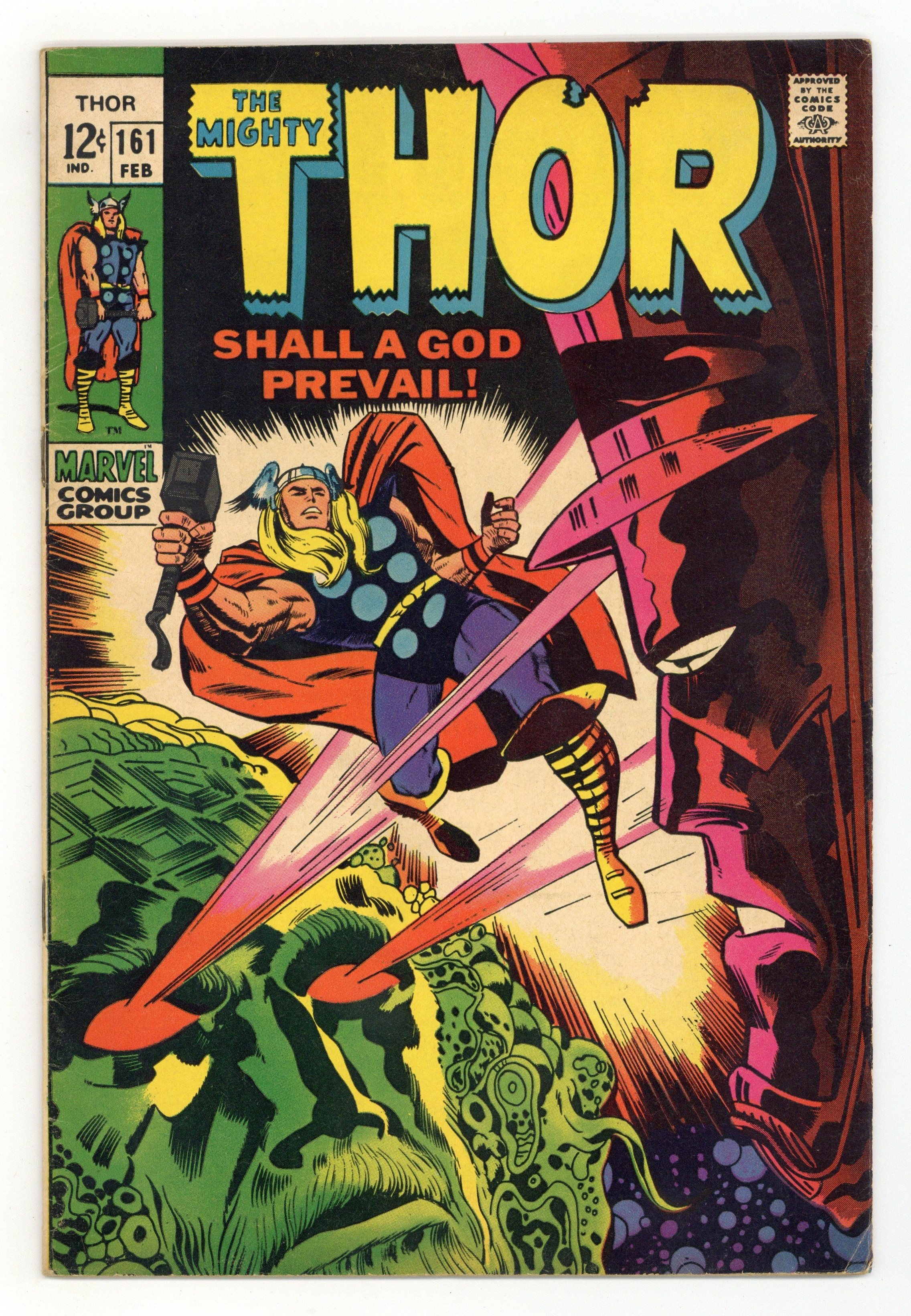 Cover pencils by Jack Kirby, inks by Vince Colletta. "Shall a God Prevail?", script by Stan Lee, pencils by Jack Kirby, inks by Vince Colletta; Thor drives Galactus away from Ego, the Living Planet; Ego then allows the homeless race of Wanderers to settle there. Appearance by the Recorder. 36 pgs., full color. $0.12. Cover price $0.12.