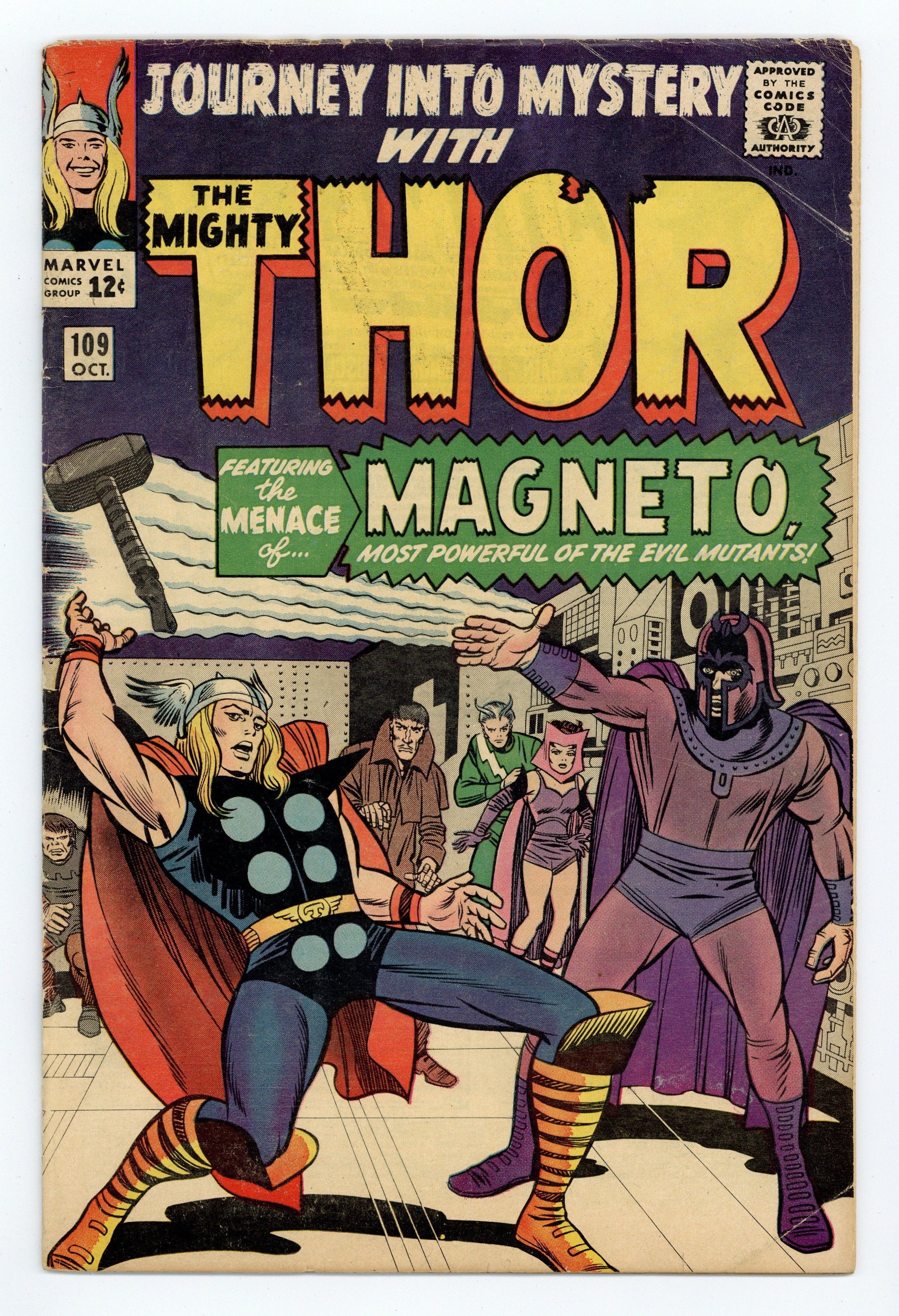 Cover pencils by Jack Kirby, inks by Chic Stone. Magneto takes a break from pestering the X-Men to battle Thor in "When Magneto Strikes!", script by Stan Lee, pencils by Jack Kirby, ink by Chic Stone; Magneto is testing his powers in the city; He "attracts" Thor's attention; They battle aboard Magneto's submarine; Meanwhile, the Brotherhood of Evil Mutants are out looking for the X-Men. Magneto flees from Thor in his escape vessel and the X-Men's submarine is seen pursuing him; Thor turns back to Don Blake and visits Jane Foster. She makes him a snack and gives him a glass of milk; Guest appearances by Quicksilver, the Scarlet Witch, Mastermind, the Toad, and Jane Foster; Cameos by Captain America, Iron Man, the Thing, Mr. Fantastic, and the Invisible Girl. "Tales of Asgard" back-up, "Banished From Asgard!", script by Stan Lee, pencils by Jack Kirby, inks by Vince Colletta; Arkin the Weak betrays Asgard in an attempt to win the hand of Queen Knorda. First letters page. 36 pgs., full color. Cover price $0.12.