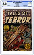 First issue of the series (continues from The Crypt of Terror). Cover by Johnny Craig. "The Thing From the Sea," script and art by Al Feldstein; During a sea voyage a passenger discovers that stateroom 13 has the reputation of being haunted. "A Fatal Caper," script by Al Feldstein, art by Jack Kamen; Teenagers remove a body from a casket in order to dress as a mystically-summoned monster and place one of their own inside as a prank; the undertaker is unaware of this and buries the body. "Backfire" text story. "Rx...Death," script by Al Feldstein, art by Graham Ingels; A sister worries that her brother is under too much stress and so asks a doctor to write a prescription for some medicine. "Impending Doom," script by Al Feldstein, art by Johnny Craig; An artist draws a frightened face with a circle around it; Thinking it odd, he goes for a walk encountering a grave-stone cutter who looks like the picture he drew carving a tombstone with his name on it. 36 pgs., full color. $0.10. Cover price $0.10.