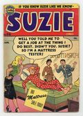 Cover by Al Fagaly. Untitled story, art by Al Fagaly; In order to earn money to buy an expensive bathing suit, Suzie takes a job at the Ladies Fashion Boutique, but proves to be of little help to the store. Suzie Puzzle Page. Untitled story, art by Al Fagaly; Suzie assists an eccentric inventor trying to market his impractical inventions. Untitled story, art by Samm Schwartz; Ferdie is hired to protect Mrs. Van Gelt's society party; Suzie tags along to make sure Ferdie doesn't make things worse, as Ferdie goes to the party disguised as a medieval knight. Untitled story, script and art by Bill Woggon; After winning a pinup contest at a local department store, Katy and Sis go to claim her prize. "The Carpenter"; Suzie and Ferdie are subcontracted to build a dog house for an ill-tempered bulldog. Untitled story; Ferdie gets into an altercation with a brute over a suit of clothes; When the brute, who is a local boxing champ, is accidentally knocked unconscious, everyone assumes Ferdie did it and fixes him up with a rematch against the champ in the boxing ring. 52 pgs., full color. Cover price $0.10.