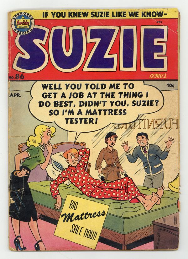 Cover by Al Fagaly. Untitled story; Suzie has her mischievous niece Angela take pin-up pictures at the beach. Pep Comics ad. Suzie's Snappy Swim Suits page by Al Fagaly. Untitled story; Suzie dreams that suicidal director J.A. Panick casts her in his movie as Juliet alongside Cary Grant. Super Duck ad. Untitled story; Suzie takes her niece Angela to the park, where Angela causes trouble. Suzie Puzzle Page by Herbert "Red" Holmdale. Untitled story, script and art by Bill Woggon; Dr. Kildear gets a new camera and decides to take pin-up photos of Katy. Suzie's Movie Diary article. "Suzie's Baby Sitter Bureau"; Suzie opens a babysitting firm and babysits for the McFoofs. Untitled story; Suzie accidentally gets drafted onto her boss's all-girls' baseball team. 52 pgs., full color. Cover price $0.10.