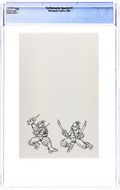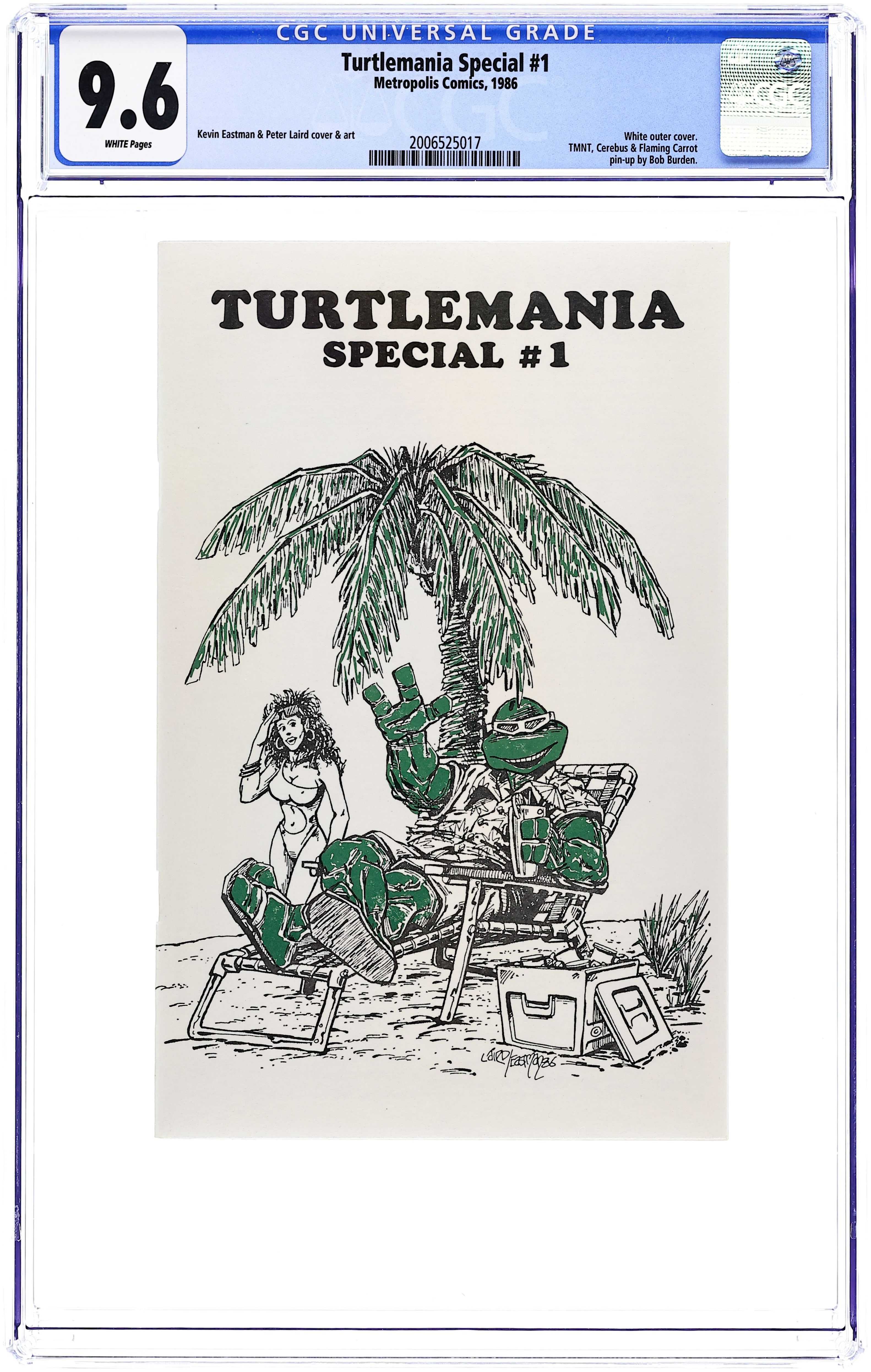 Kevin Eastman and Peter Laird cover. Includes previously unpublished pages of T.M.N.T. artwork. Centerfold splash featuring Cerebus, Flaming Carrot, and the turtles by Bob Burden. Plus a rogues gallery and upcoming previews. Ashcan format, 5 1/2" x 8 1/2", b&w, 32 pages, 3,000 print run.