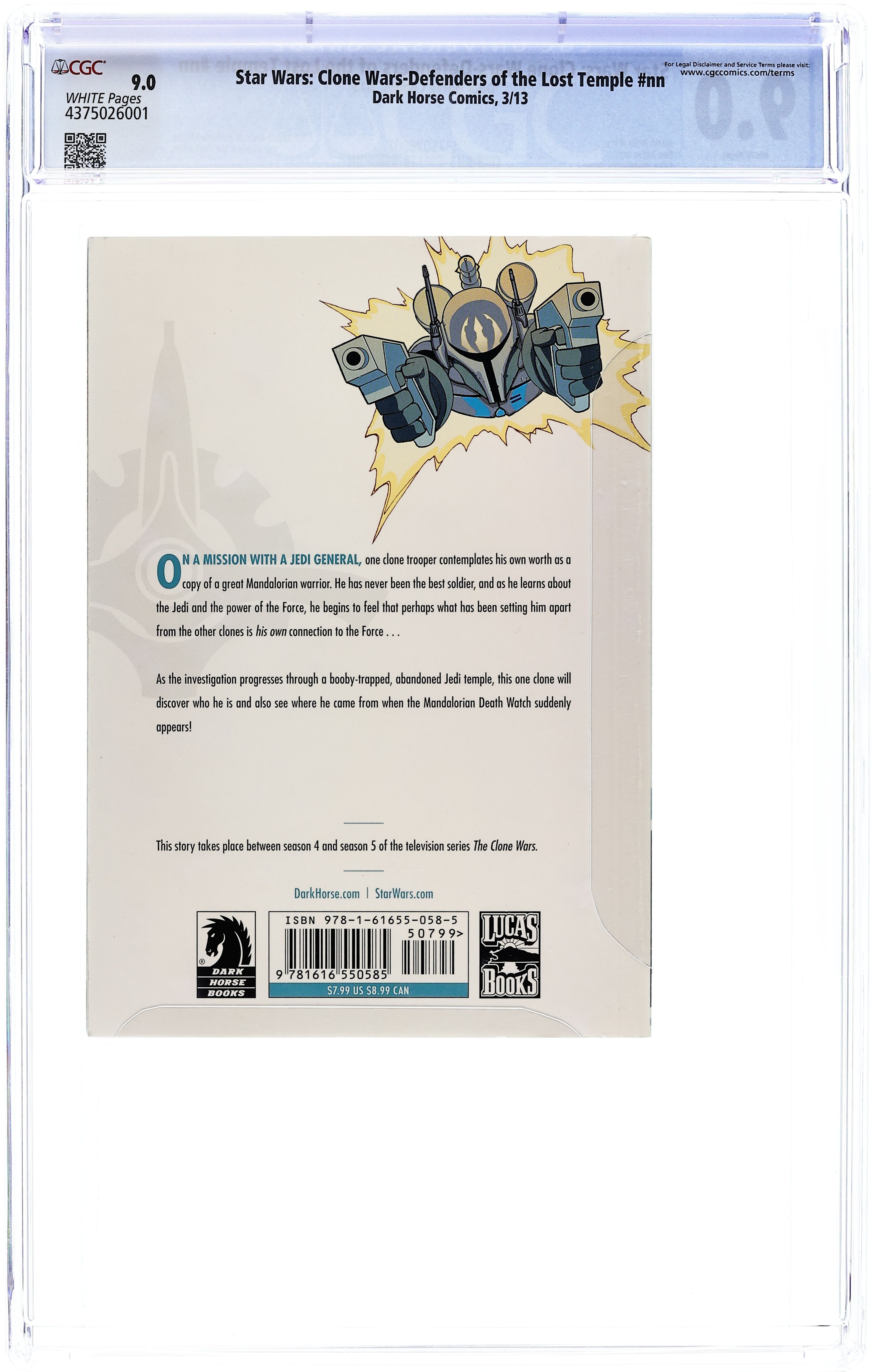 On a mission with a Jedi general, one trooper contemplates his own worth as a clone of the great Mandalorian warrior Jango Fett. As mission leads through a booby-trapped, abandoned Jedi Temple, this one clone will discover who he is and also where he came from when the Mandalorian Death Watch suddenly appears!