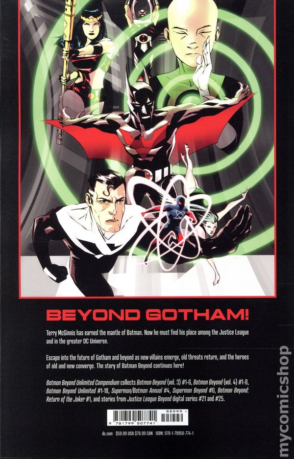 1st printing. Collects Batman Beyond (2010 3rd Series) #1-6, Batman Beyond (2011 4th Series) #1-8, Batman Beyond Unlimited (2011-2013) #1-18, Superman Batman (2003-2011) Annual #4, Superman Beyond (2011 DC) #0, stories from the Justice League Beyond digital series #21 and #25, and Batman Beyond: Return of the Joker (2001). Written by Adam Beechen, Derek Fridolfs, J.T. Krul, Dustin Nguyen, Paul Levitz, Darren Vingenzo, Tom DeFalco, Scott Peterson, and Ron Frenz. Art by Ryan Benjamin, Howard Porter, Norm Breyfogle, Dustin Nguyen, Adam Archer, Ben Caldwell, Renato Guedes, Craig Rousseau, Jorge Corona, Ron Frenz, Annie Wu, Chris Batista, Eric Nguyen, Peter Nguyen, Eduardo Pansica, James Brouwer, Fiona Staples, Marcos To, Jose W. Magalhaes, Sal Buscema, Eber Ferreira, Rich Perrotta, and Craig Yeung. Cover by Dustin Nguyen. Terry McGinnis has earned the mantle as Batman, and now he must find his place among the Justice League and the greater DC Universe. Escape into the future of Gotham and beyond as new villains emerge, old threats return, and the heroes of old and new converge. The story of Batman Beyond continues here! Softcover, 1,208 pages, full color. Teen Cover price $59.99.