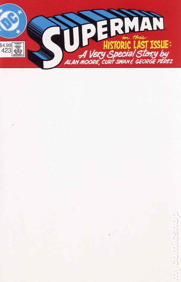 (W) Alan Moore (A) Curt Swan (CA) Blank ALAN MOORE'S GROUNDBREAKING STORY! Whatever Happened to the Man of Tomorrow? begins the final, farewell story of the Silver Age Superman, as told by legendary scribe Alan Moore. Acclaimed by many to be the finest Superman story ever written, this classic tale is a bittersweet love letter to both Superman and super fans alike. Cover price $4.99.