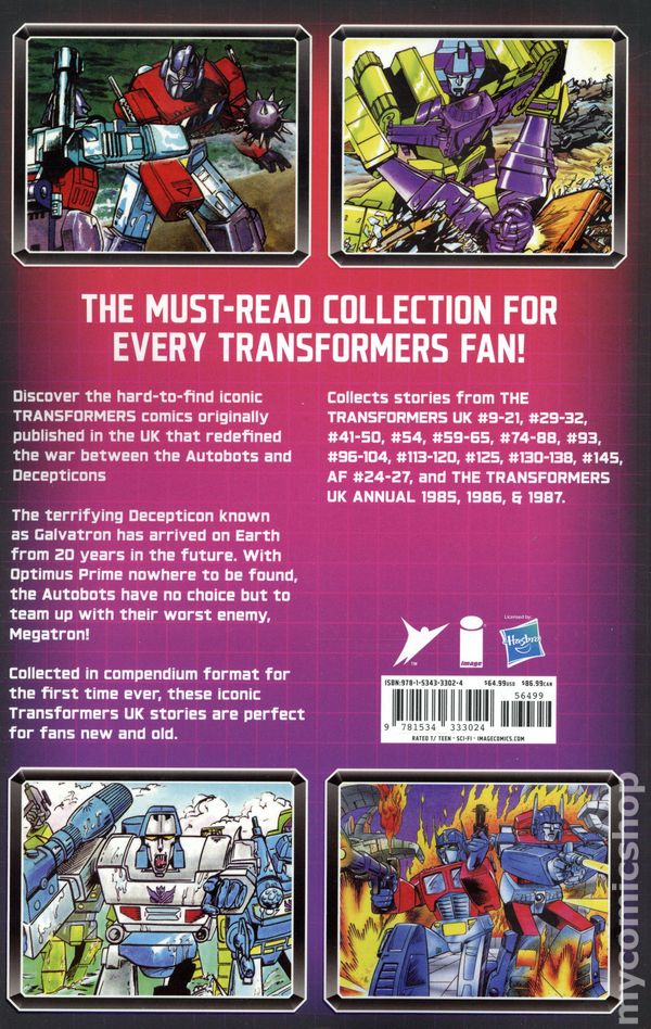 Volume 1 - 1st printing. Collects stories from The Transformers (UK 1984-1992 Marvel) Magazine #9-21, 29-32, 41-50, 59-65, 74-88, 96-104, 113-120, 125, 131-138, 145; Action Force (UK 1987-1988 Marvel) Magazine #24-27, and The Transformers Magazine (1985-1991 UK) Annual #1985, 1986, and 1987. Written by Steve Parkhouse, Simon Furman, James Hill, Mike Collins, Barry Kitson, Ian Rimmer, Wilf Prigmore, Jamie Delano, and Ian Rimmer. Art by John Ridgeway, Mike Collins, John Stokes, Barry Kitson, Will Simpson, Geoff Senior, Dave Hine, Jeff Anderson, Ron Smith, Martin Griffiths, Dan Reed, Stephen Baskerville, Mark Farmer, Marc Griffiths, Tim Perkins, Andrew Leary, Dave Harwood, and Dave Elliot. Cover by Jorge Corona and Mike Spicer. THE MUST-READ COLLECTION FOR EVERY TRANSFORMERS FAN! Discover the hard-to-find iconic TRANSFORMERS comics originally published in the UK that redefined the war between the Autobots and Decepticons. The terrifying Decepticon known as Galvatron has arrived on Earth from 20 years in the future. With Optimus Prime nowhere to be found, the Autobots have no choice but to team up with their worst enemy, Megatron! Collected in compendium format for the first time ever, these iconic Transformers UK stories are perfect for fans new and old. Softcover, 1,064 pages, full color. Teen Cover price $64.99.