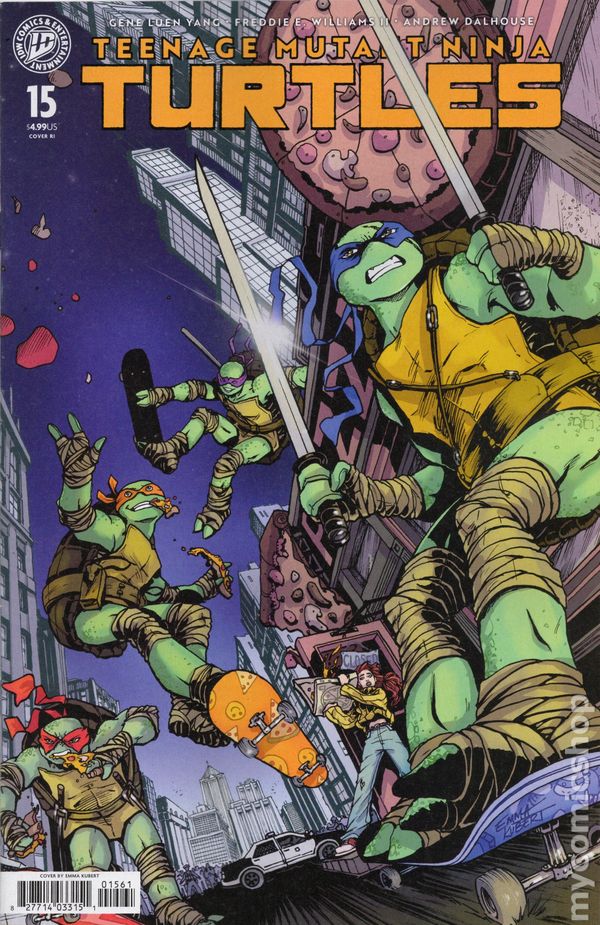 Limited 1 for 50 Retailer Incentive Variant Cover. (W) Gene Luen Yang (A) Freddie E. Williams II (CA) Emma Kubert Father and sons, together again! The Turtles are overjoyed to have Splinter back with them, but there are dark things lurking in the shadows—a mysterious new magic-wielding foe disrupts the family reunion! The Turtles also learn who Ujigamis next target is, and the race is on to save one of their greatest allies! 32 pages, full color, not rated. Cover price $4.99.