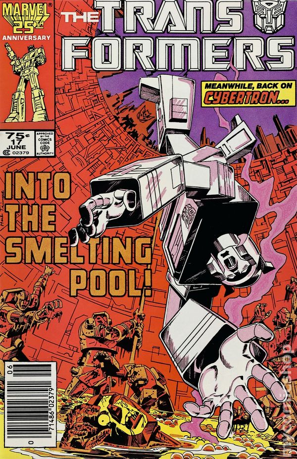 First Printing. Newsstand Edition. Back on Cybertron, the home planet of the Transformers, the war between the Decepticons and Autobots continues. Scrounge, an Autobot, discovers important and revealing news but is kidnapped before he can relay the news to his Autobot comrades. So Blaster and the other Autobots resolve to find and rescue Scrounge in "Return to Cybertron – Part 1 – The Smelting Pool." Script by Bob Budiansky and art by Don Perlin & Keith Williams. Cover by Herb Trimpe. Cover price $0.75.