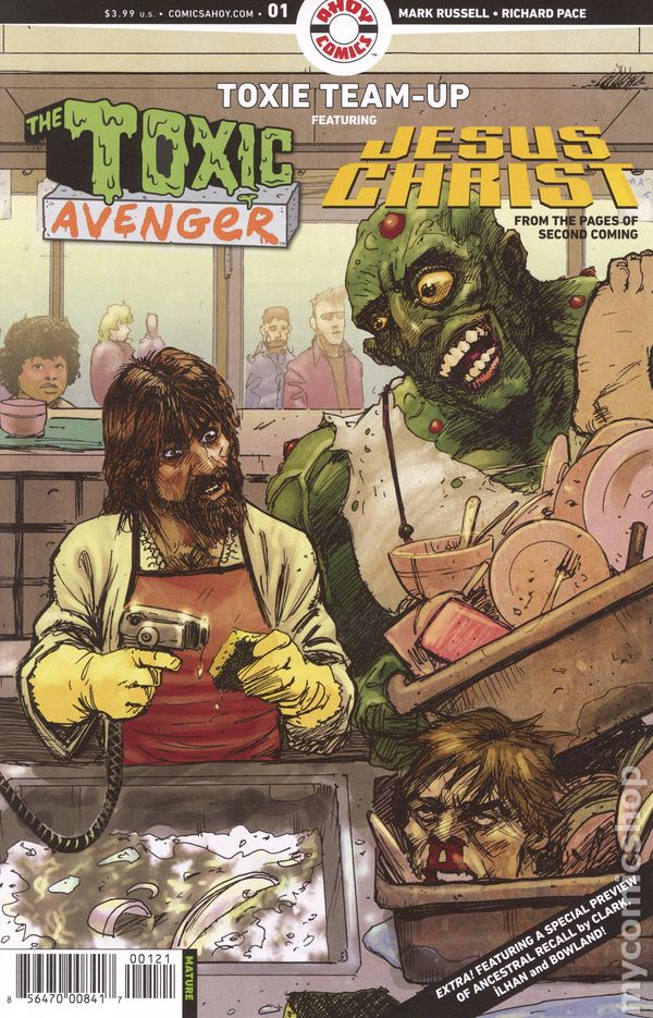 Written by Mark Russell. Art and Cover by Richard Pace Spinning straight out of his acclaimed solo title, the Toxic Avenger battles alongside some of comics' greatest and most controversial superstars in this surprise limited series. First up, from AHOY's own SECOND COMING: Jesus Christ, the Son of God! Written and drawn by that smash hit comic's creative team, Mark Russell (Batman: Dark Age) and Richard Pace, with a cover by Toxie's own artist, Fred Harper! 28 pages, full color. Rated M Cover price $3.99.