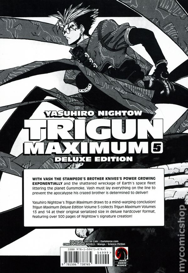 Volume 5 - 1st printing. Collects Trigun Maximum GN (2004-2009 Dark Horse) Vol. 13-14. Story and art by Yasuhiro Nightow. Yasuhiro Nightow's Trigun Maximum draws to a mind-warping conclusion! With Vash the Stampede's brother Knives's power growing exponentially, and the shattered wreckage of Earth's space fleet littering the planet Gunsmoke, Vash must lay everything on the line to prevent the apocalypse his crazed brother is determined to deliver! Holding nothing back, Vash goes toe-to-toe with Knives in a final cataclysmic confrontation, with the future of humanity and his home planet hanging in the balance. This edition collects Trigun Maximum volumes 13 and 14 in a deluxe hardcover format featuring nearly 600 pages of Nightow's signature creation at the original serialized size! Hardcover, 7-in. x 10-in., 560 pages, B&W. Mature Readers Cover price $49.99.