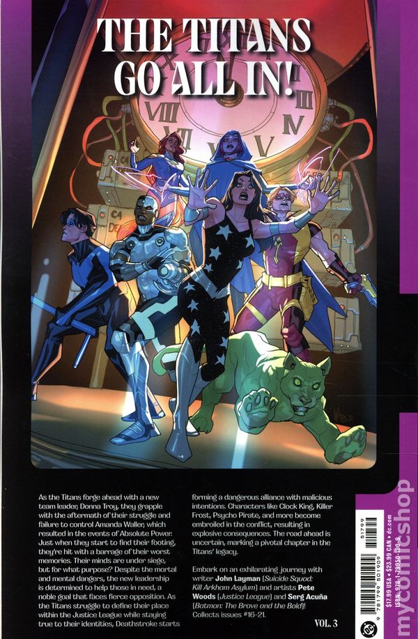 Volume 3 - 1st printing. "Hard Feelings!" Collects Titans (2023 DC) #16-21. Written by John Layman. Art by Pete Woods and Serg Acuna. Cover by Pete Woods. THE TITANS GO ALL-IN! As the Titans forge ahead with a new team leader, Donna Troy, they grapple with the aftermath of their struggle and failure to control Amanda Waller. Just when they start to find their footing, they're hit with a barrage of their worst memories. Their minds are under siege, but for what purpose? Despite the mortal and mental dangers, the new leadership is determined to help those in need, a noble goal that faces fierce opposition. As the Titans struggle to define their place within the Justice League while staying true to their identities, Deathstroke starts forming a dangerous alliance with malicious intentions. Characters like Clock King, Killer Frost, Psycho Pirate, and others become embroiled in the conflict, resulting in explosive consequences. The road ahead is uncertain, marking a pivotal chapter in the Titans' legacy. Softcover, 136 pages, full color. Rated 13+ Cover price $17.99.