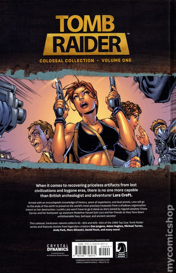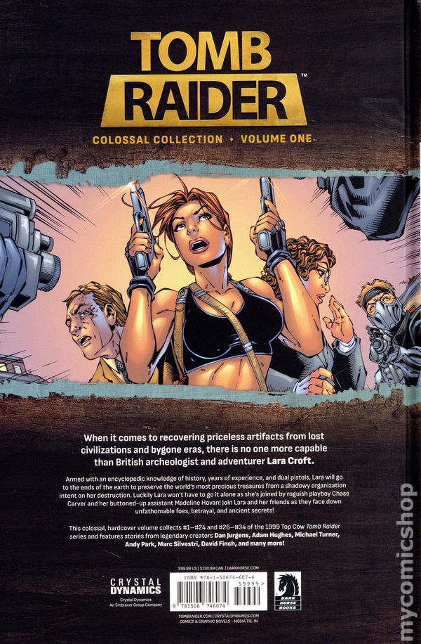 2nd and later printings. Collects Tomb Raider (1999-2005 Top Cow) #1-24 and 26-34. Written by Dan Jurgens, John Ney Reiber, Adam Hughes, and James Bonny. Art by Andy Park, Billy Tan, Francis Manapul, Gerardo Sandoval, Randy Green, Scott Benefiel, Tony Daniel, Pop Mhan, Jon Sibal, Danny Miki, Victor Llamas, John Livesay, Jason Gorder, Marlo Alquiza, Kevin Conrad, Rick Ketcham, Joel Gomez, and Crime Lab Studios. Cover by Andy Park and Jon Sibal. When it comes to recovering priceless artifacts from lost civilizations and bygone eras, there is no one more capable than British archeologist and adventurer Lara Croft. Armed with an encyclopedic knowledge of history, years of experience, and dual pistols, Lara will go to the ends of the earth to preserve the world's most precious treasures from a shadowy organization intent on her destruction. Luckily Lara won't have to go it alone as she's joined by roguish playboy Chase Carver and her buttoned-up assistant Madeline Hovan! Join Lara and her friends as they face down unfathomable foes, betrayal, and ancient secrets! This colossal, hardcover volume collects #1-24 and #26-34 of the Top Cow Tomb Raider series from 1999 to 2003 and features stories from legendary creators Dan Jurgens, Adam Hughes, Michael Turner, Andy Park, Marc Silvestri, David Finch, and many more! Hardcover, 888 pages, full color. Cover price $99.99.