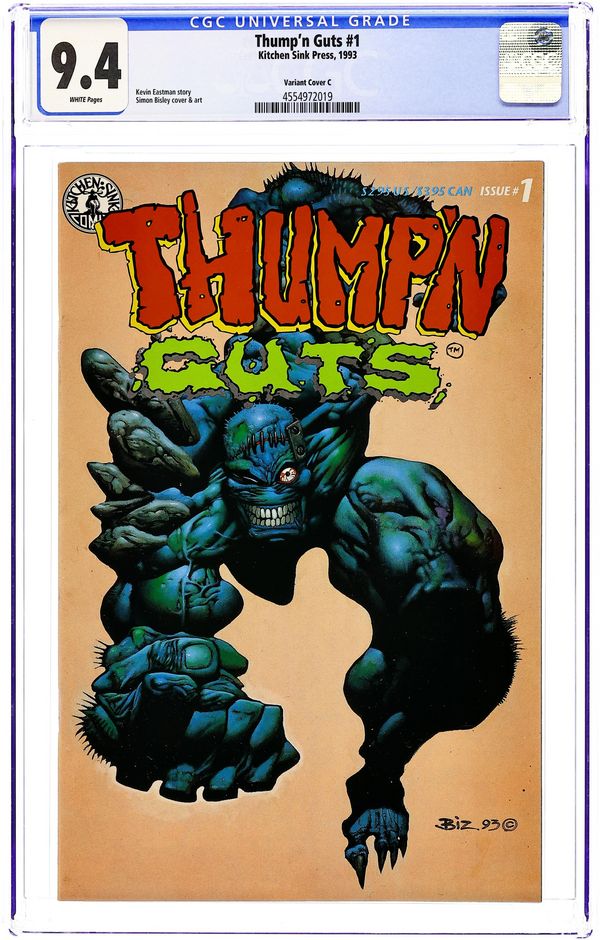 - Variant Cover C. Includes Original Poly-Bag, Kevin Eastman Poster, trading card, and Thump'n Guts $100 bill replica sealed in a plain white envelope.