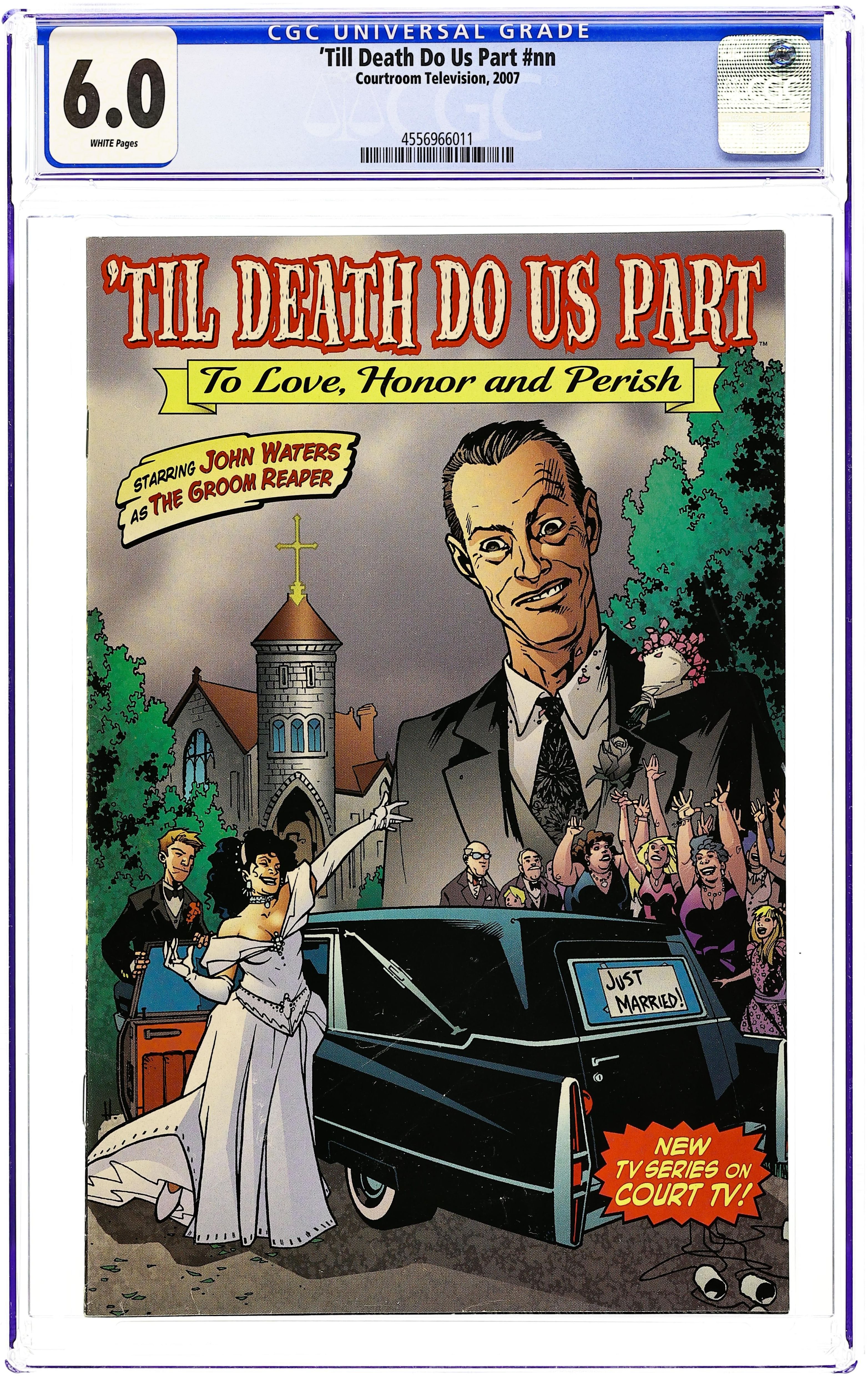 Court TV promotional item for the television show 'Til Death Do Us Part starring John Waters. "Funeral Parlor Murder" written by James Peaty with art by Adam Dekraker. Full color, 12 pages, slick paper stock.