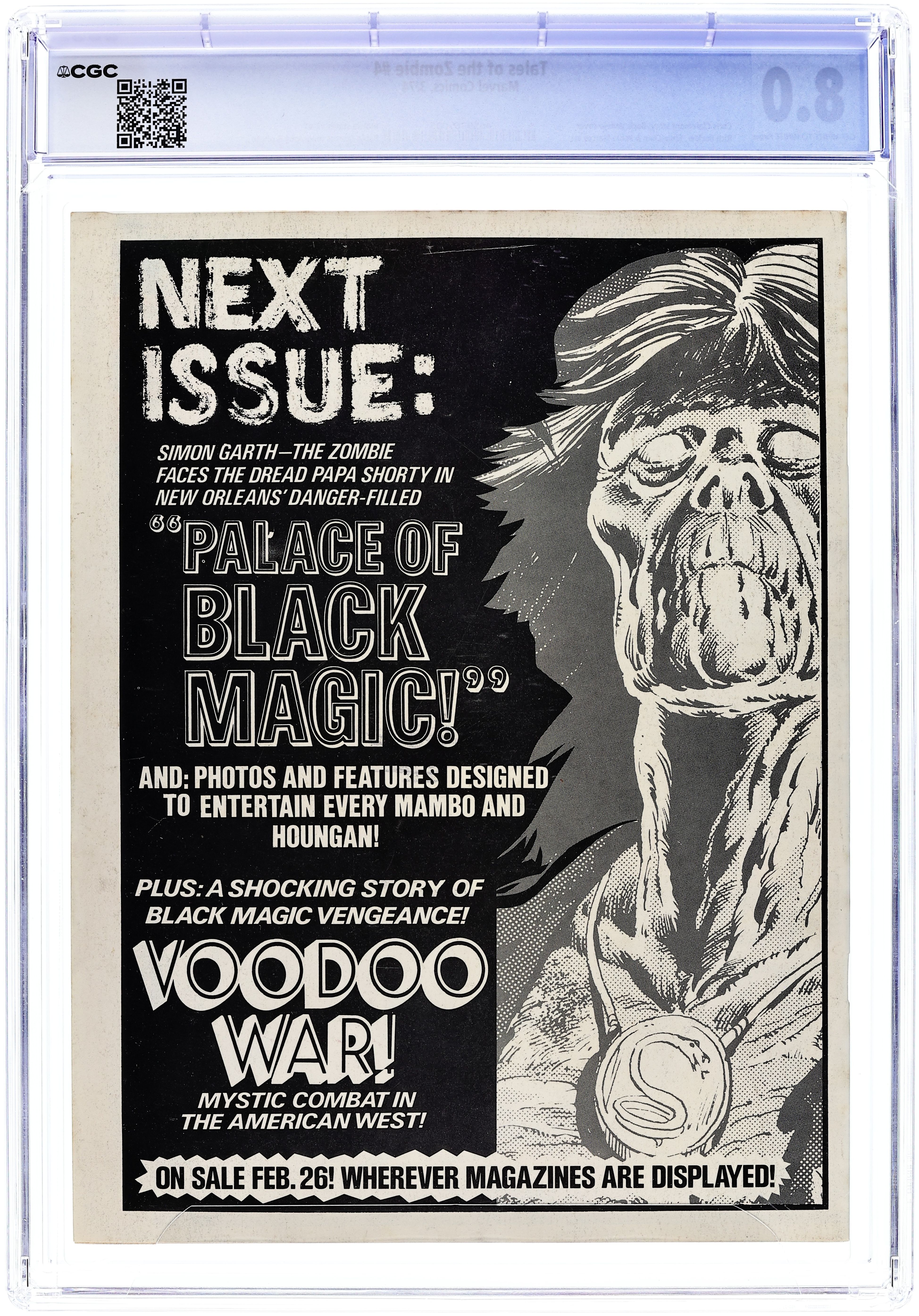 Simon Garth dies but is brought back to life as a zombie and doomed to walk the earth as one of the living dead. In "The Law and Phillip Bliss" and "Dead Man's Judgment," the Amulet of Damballah calls Simon Garth back to New Orleans for a devastating day in court. Script by Steve Gerber and art by Pablo Marcos. Issue also has "James Bond Meets Baron Samedi or Live and Let Die Revisted" (an article about the movie by Don McGregor), "The Drums of Doom" (Script by Gerry Conway and art by Rich Buckler, Vic Martin and Win Mortimer), an article about witchcraft by Lin Carter, "Courtship By Voodoo" (Script by Tony Isabella and art by Ron Wilson), "Nightfilth Rising" (Script by Doug Moench and art by Win Mortimer), and "Four Daughters of Satan" (Script by John Albano and art by Ernie Chua). All stories are in black and white. V2#1 in indicia, March 1974 on cover. Cover price $0.75.