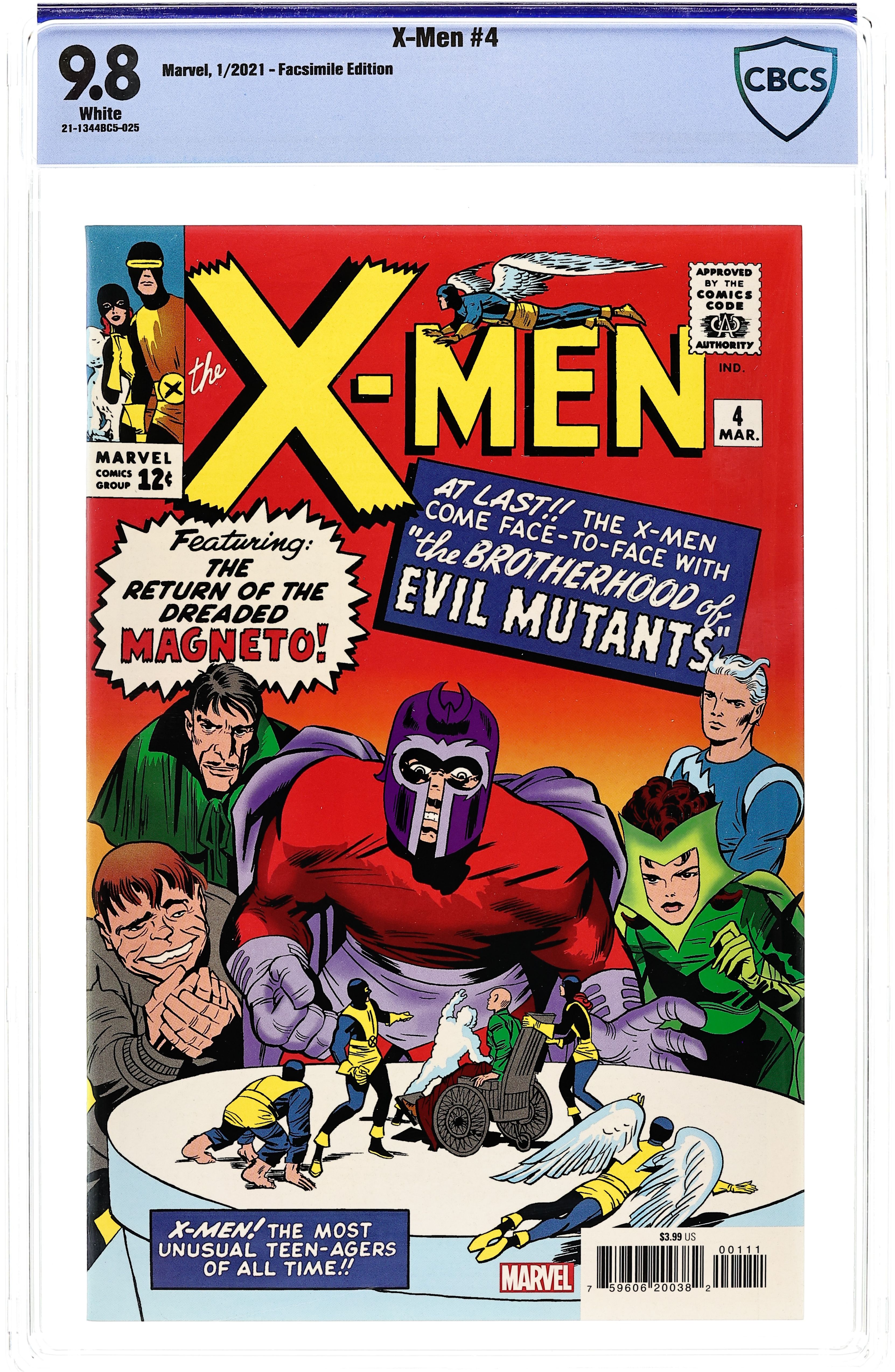 Written by Stan Lee. Art by Jack Kirby and Paul Reinman. Cover pencils by Jack Kirby. INTRODUCING THE SCARLET WITCH! Magneto returns to battle the X-Men, and he's brought the new Brotherhood of Evil Mutants! Courtesy of the boundless imaginations of Stan Lee and Jack Kirby, Quicksilver and the Scarlet Witch enter the Marvel Universe alongside enduring mutant menaces Toad and Mastermind! As Magneto and Professor X clash on the astral plane, the Brotherhood overruns and conquers the small nation of Santo Marco in the name of mutant supremacy, and the stage is set for a dramatic showdown with the X-Men! A rivalry for the ages begins here, and Wanda and Pietro Maximoff start their incredible journey from villainy to their ultimate destiny in the mighty Avengers! It's one of the all-time great Marvel comic books, boldly re-presented in its original form, ads and all! Reprinting X-MEN (1963) #4. 32 pages, full color. All Ages Cover price $3.99.