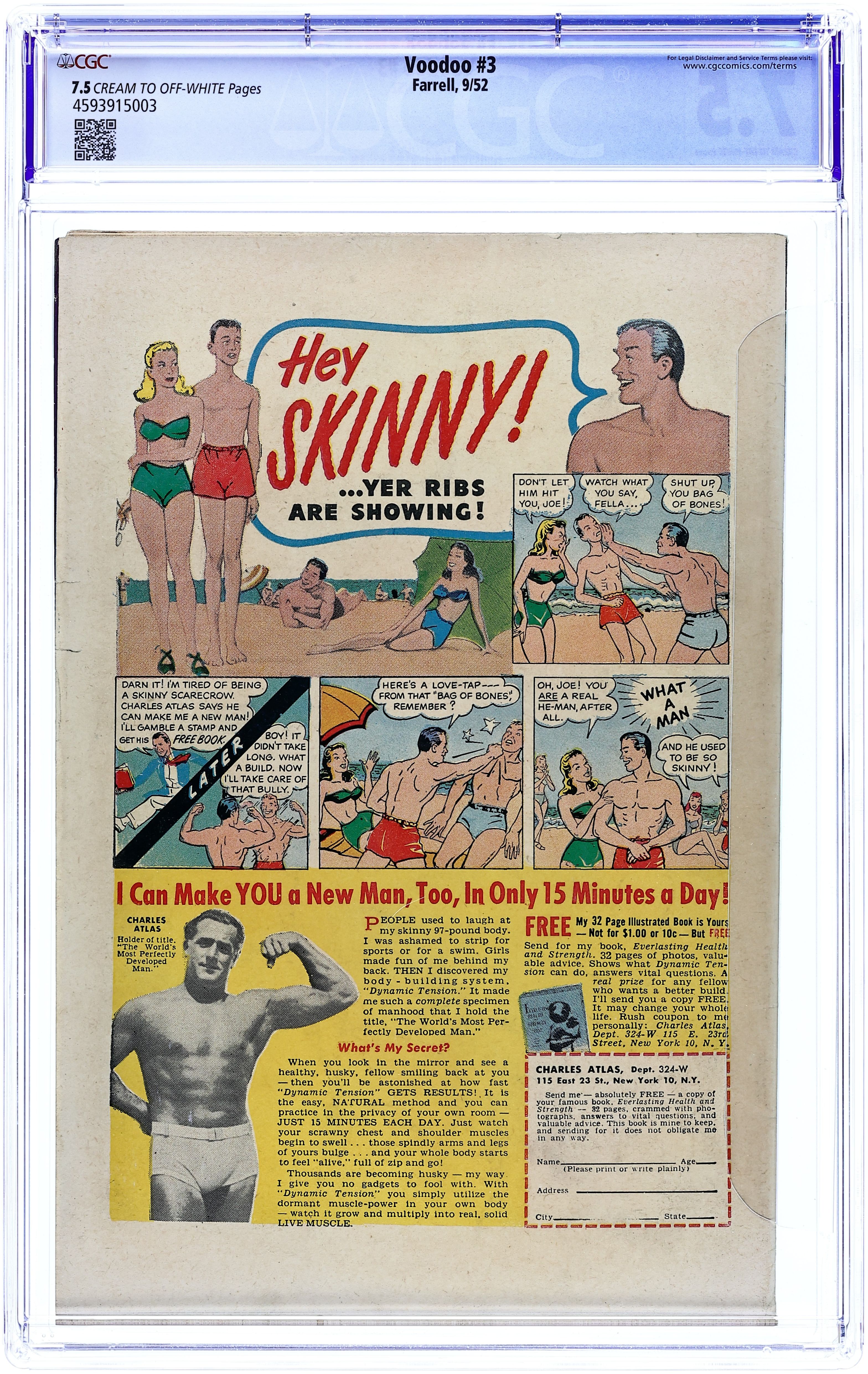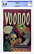 Ajax-Farrell's horror series Voodoo managed to stand out in the crowded field of pre-Code horror comics by dint of its sheer weirdness. A dying man makes an unholy pact involving his brain and a mad scientist. A look at the use of forensic science in 1950s police work. A man travels to his ancestral Scottish estate and encounters the deadly ghost named The Red Laird. Skulls of Doom; Fear Has a Name; Hangman's Noose; Blood and Barbed Wire; Castle of Fright. 36 pages, Full Color. Cover price $0.10.