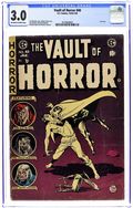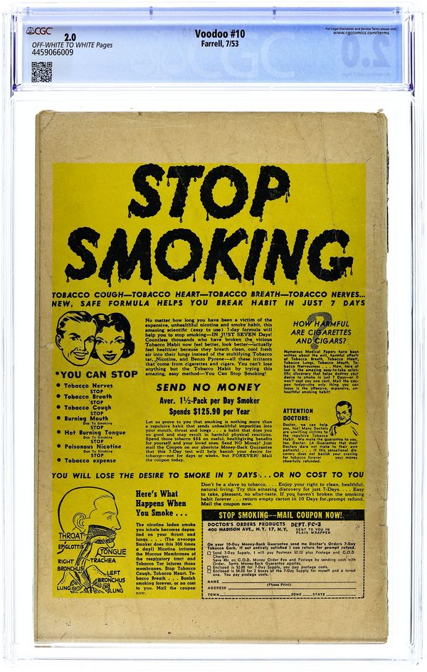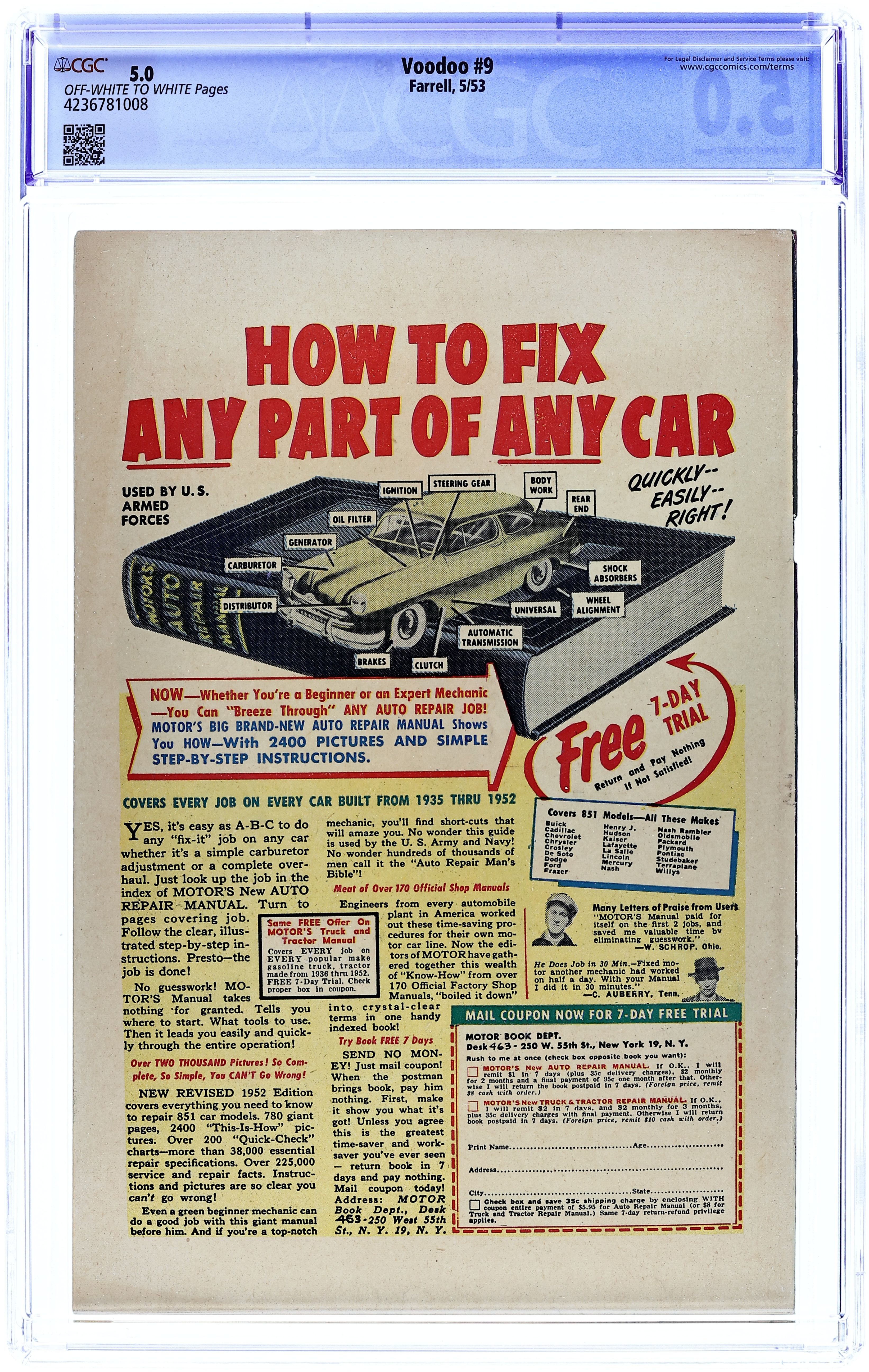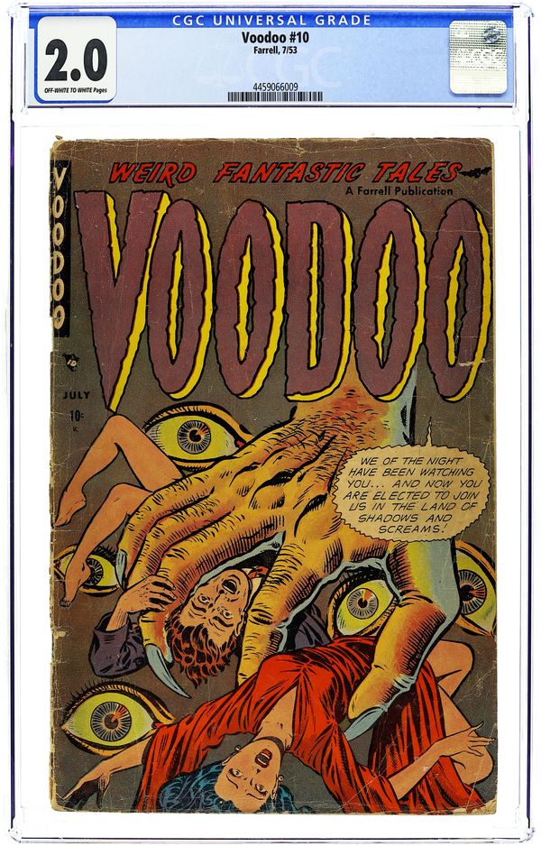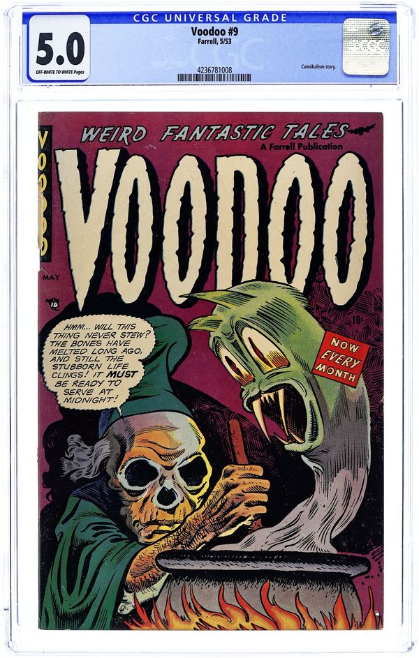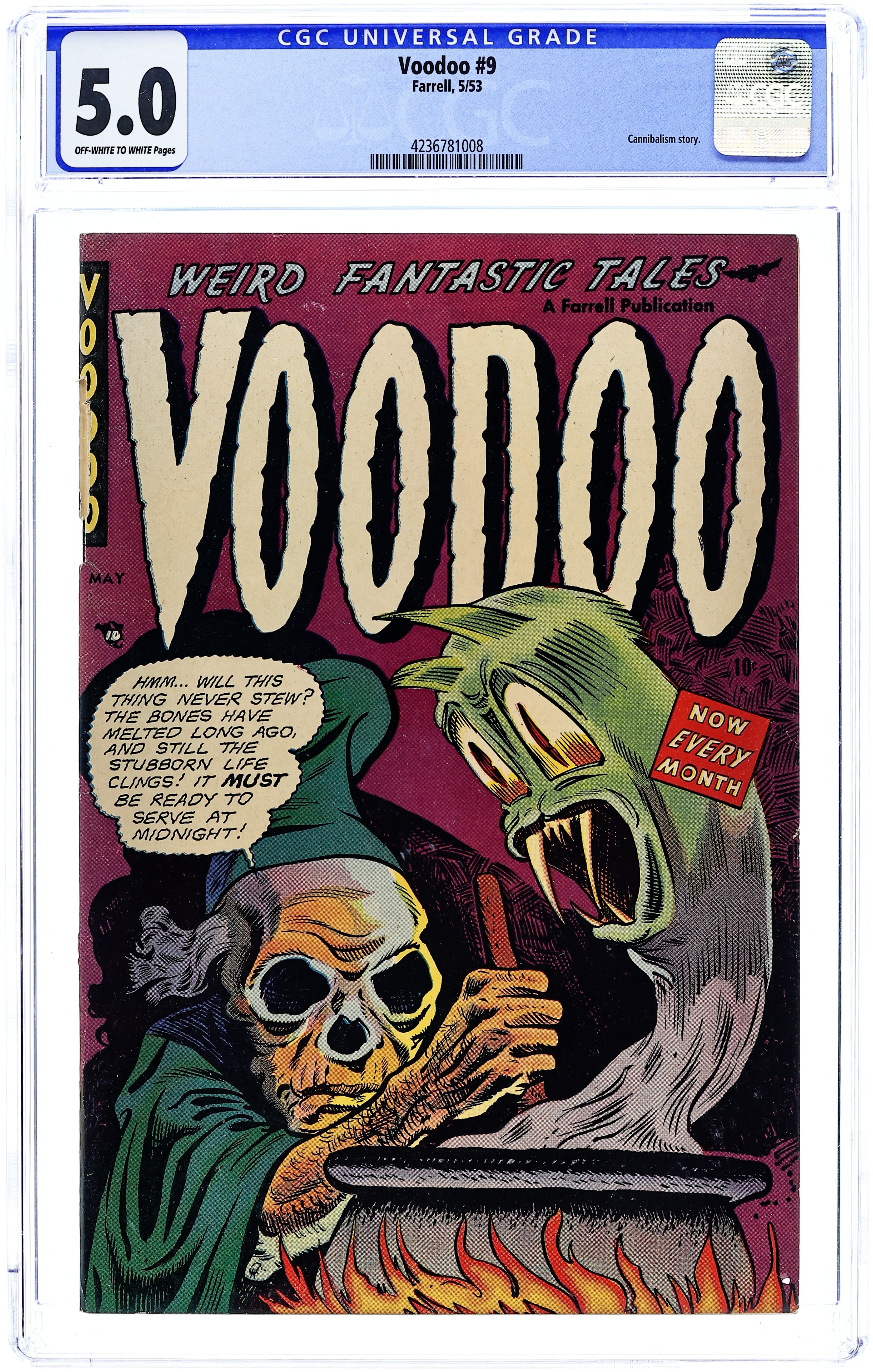 Stories and art by Matt Baker and others. Ajax-Farrell's horror series Voodoo managed to stand out in the crowded field of pre-Code horror comics by dint of its sheer weirdness. A hobo keeps a deal, even after death. Explorers face being sacrificed to a sun god, unless they can somehow use an approaching eclipse in their favor. Paranormal investigator Dr. Trimm realizes that Ellen's uncle Caleb is not a ghost, or even dead at all. A Coffin Waits...; Ghost Gloves; Ghost of R'wana; Skeletons Have Secrets!; The Witch's Curse!; The Ghoul and the Guest; Death Claws; Nightmare Message!; The Captain Who Wouldn't Die!; Primitive Peril!; The Shelf of Skulls; The Golden Ghouls; Jungle Magic; The Werewolf; Voodoo Fact or Fancy?; The Haunted One. 100 pages, Full Color. Cover price $0.25.