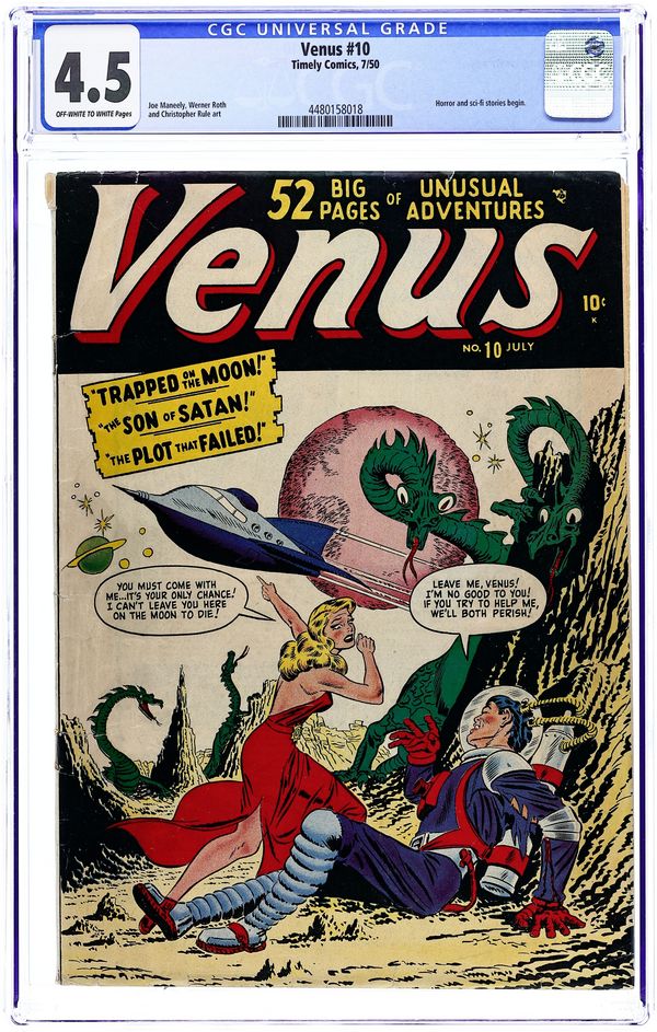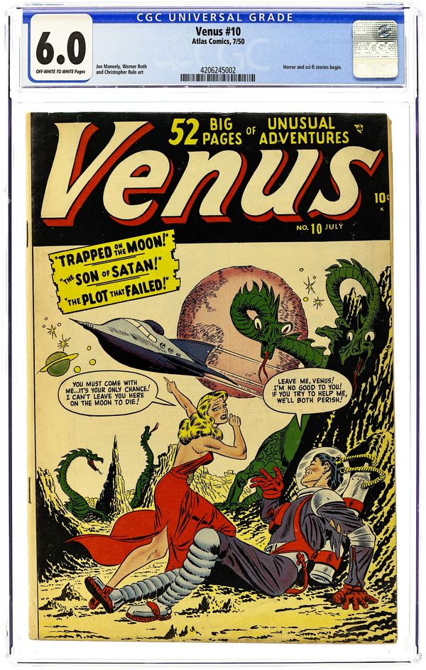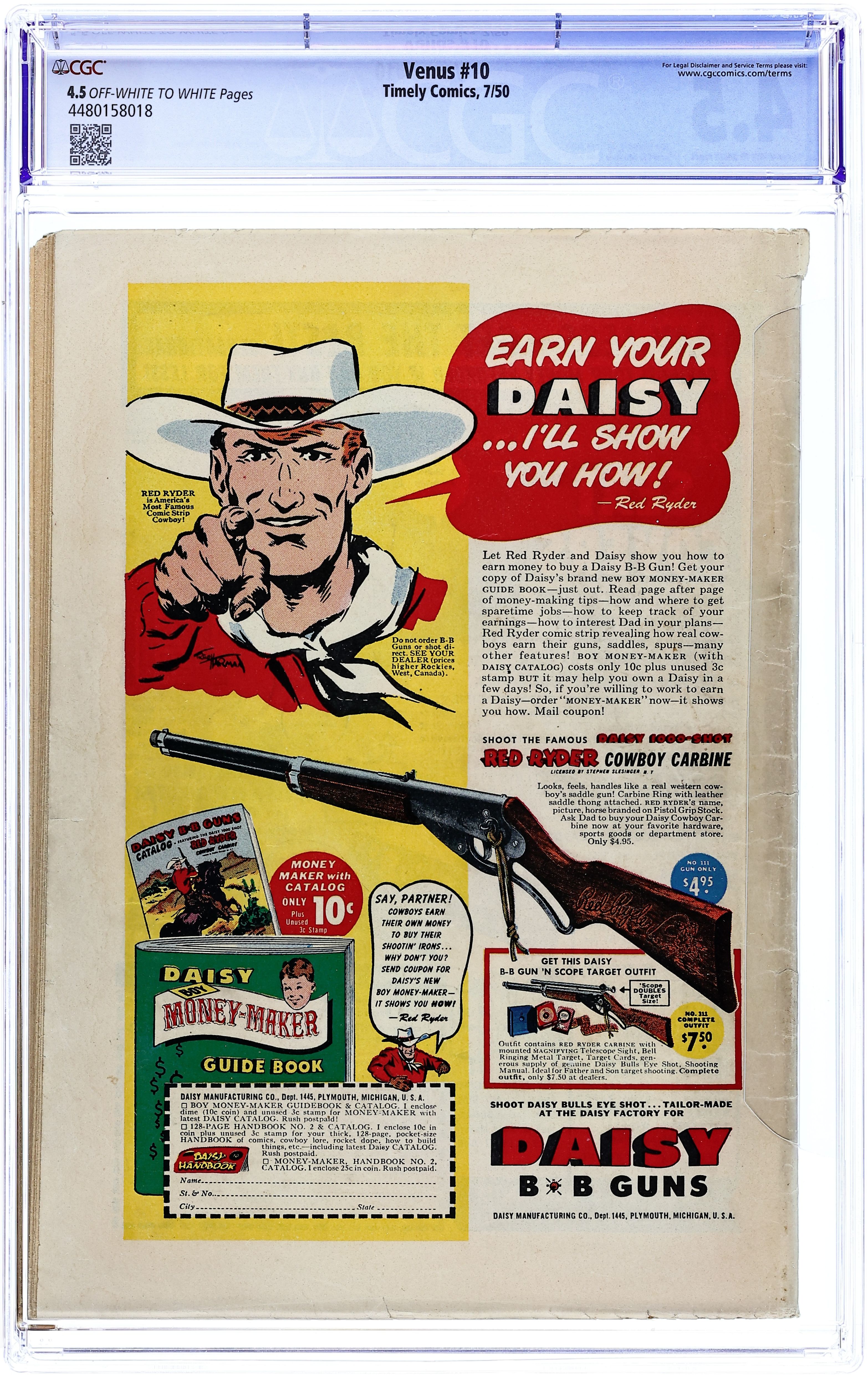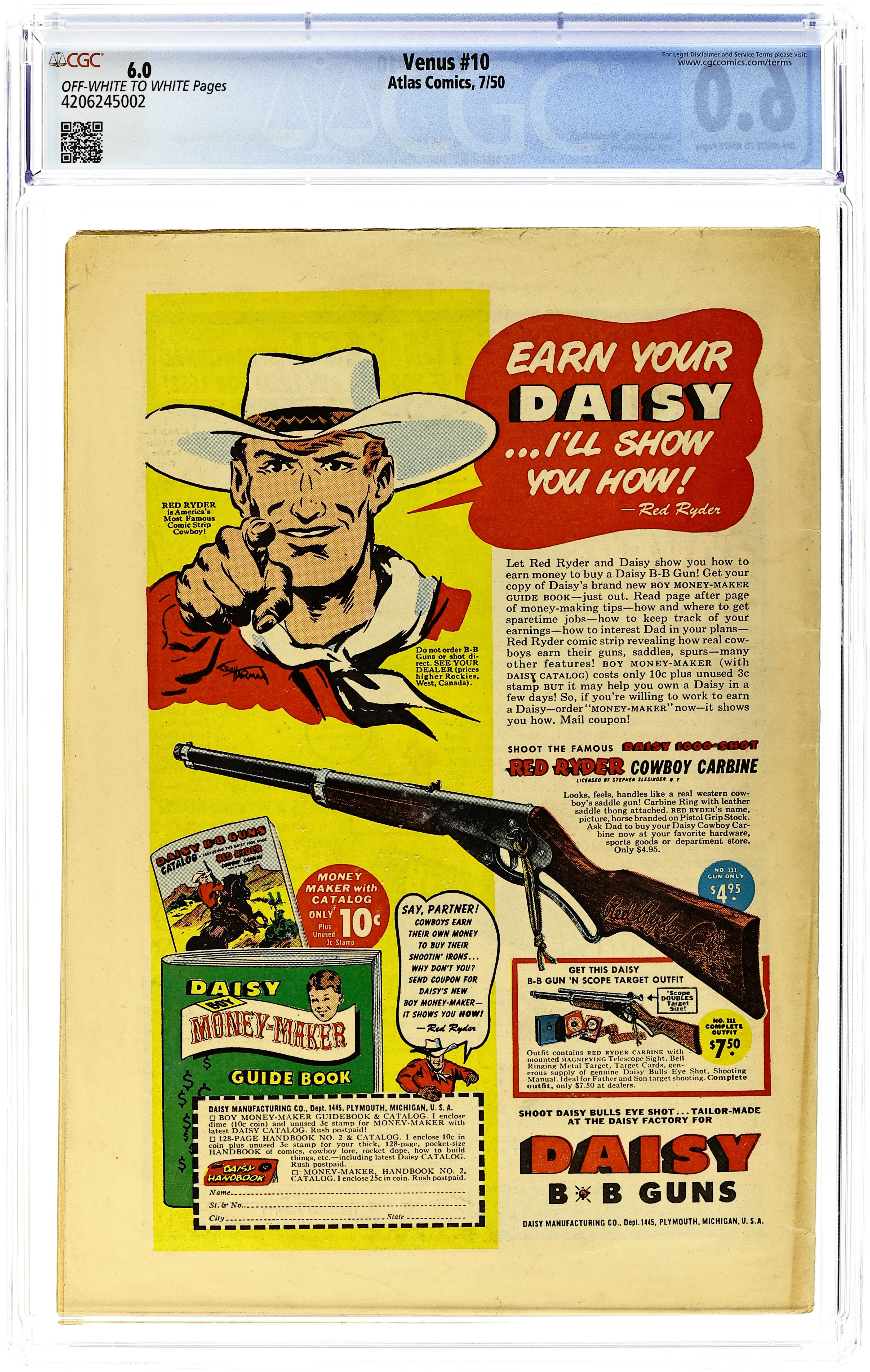 "The King of the Living Dead!" Venus helps convince a mad gypsy that creating zombie girls is not in his best interests. "The Last Day on Earth!" The gods help Venus defeat a rogue military man, who is bent on destroying U.S. forces. Also includes: "The Creeping Death"; "Invasion from Mars!"; and "The Evil Coin." Pencils and inks by Dave Berg. Cover by Bill Everett. 36 pages, full color. Cover price $0.10.