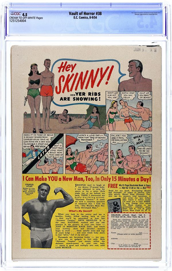 Stories by Stan Lee and unknown. Art by Jerry Robinson, Ed Winiarski, Don Perlin, Jack Keller, Gene Colan, Abe Simon and unknown. "Crazy" by Stan Lee and Jerry Robinson - A motorist hits a pedestrian and keeps going. When he gets to a small town the people observe him strangely and he thinks they must not get many visitors. They gather around his car with sticks and rope. They bind him and he asks them if they are crazy. It turns out the body of the man he struck is still in the car's grill. Plus: "The Slave" with art by Ed Winiarski - Sailor Joe Garcy travels to South America to seek his fortune. Discovering that Inca natives traditionally bury their dead with their belongings, he begins robbing crypts in search of riches. During a funeral procession, he disguises himself as an Inca slave to gain access to the burial vault. Once inside however, all of the slaves, including Joe Garcy, are sealed up behind the walls to die. Also in this issue: "The Tin Cup" with art by Don Perlin and Abe Simon - An actor poses as crippled, scarred and blind in one eye so as to bilk people out of sympathy money but then fate conspires to inflict such deformities upon him for real; "He Died Screaming" with art by Jack Keller - A man doesn't want his daughter to learn where he keeps his money so he shuts himself in with it, only remembering too late that his hiding place is soundproof and airtight; "Escape...to What?" - A man tries to escape from Hell and fails; and 2-page text story "Bill and the Beanstalk" with illo by Gene Colan. 32 pages, full color. Cover price $0.10.