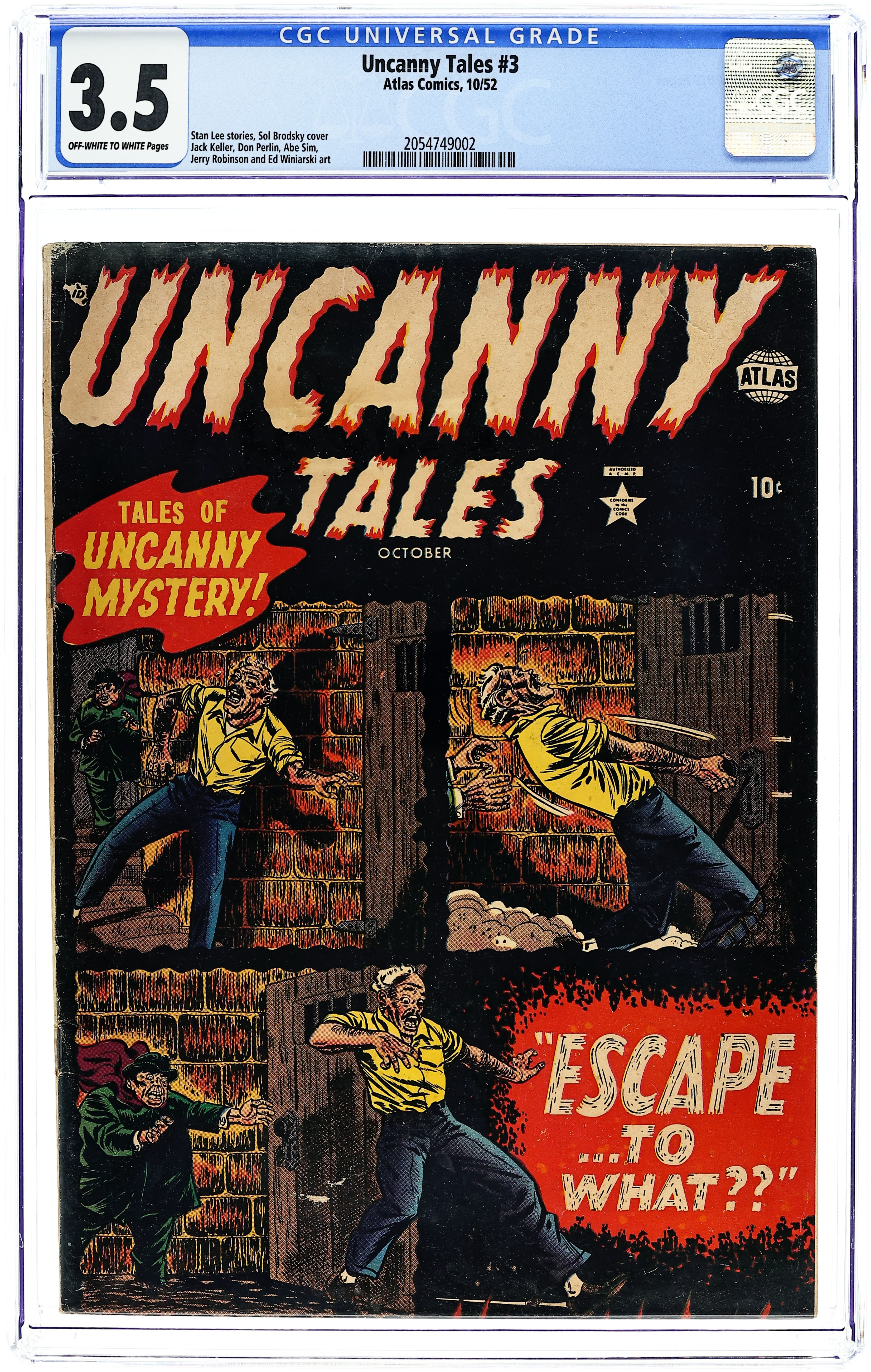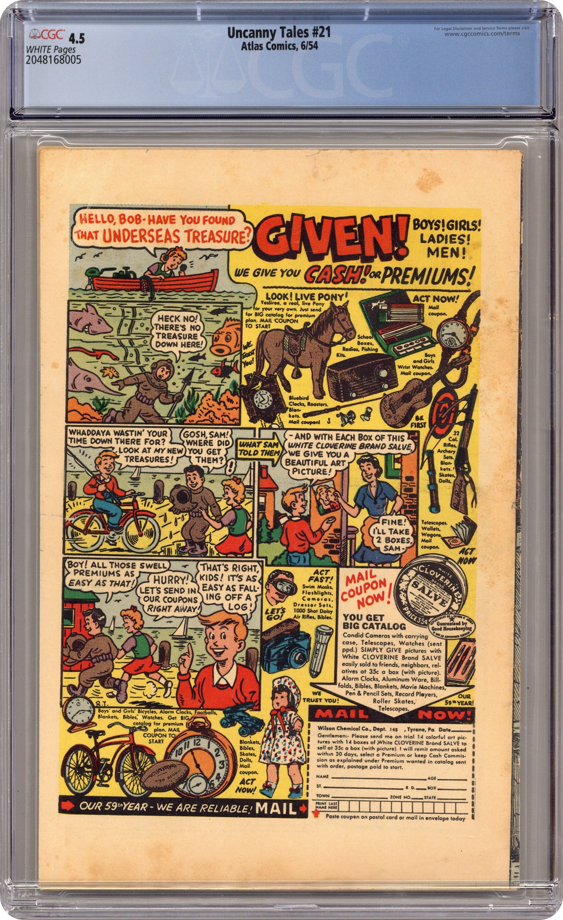 Cover by Russ Heath. Stories by unknown. Art by John Forte, Ed Winiarski, Al Eadeh, Vince Colletta and Bob Powell. The most uncanny tales ever told! In this issue: "One Second Till Doom!" with art by John Forte; "The Last Vampire" with art by Ed Winiarski; "One Little Man" with art by Al Eadeh; "The Machine Age" with art by Vince Colletta; "The Face in the Mirror" with art by Bob Powell; and 2-page text story "A Favor from Satan," reprinted from Astonishing (1951 Marvel/Atlas) #13 (original title: "The Demon of Disaster"). 32 pages, full color. Cover price $0.10.