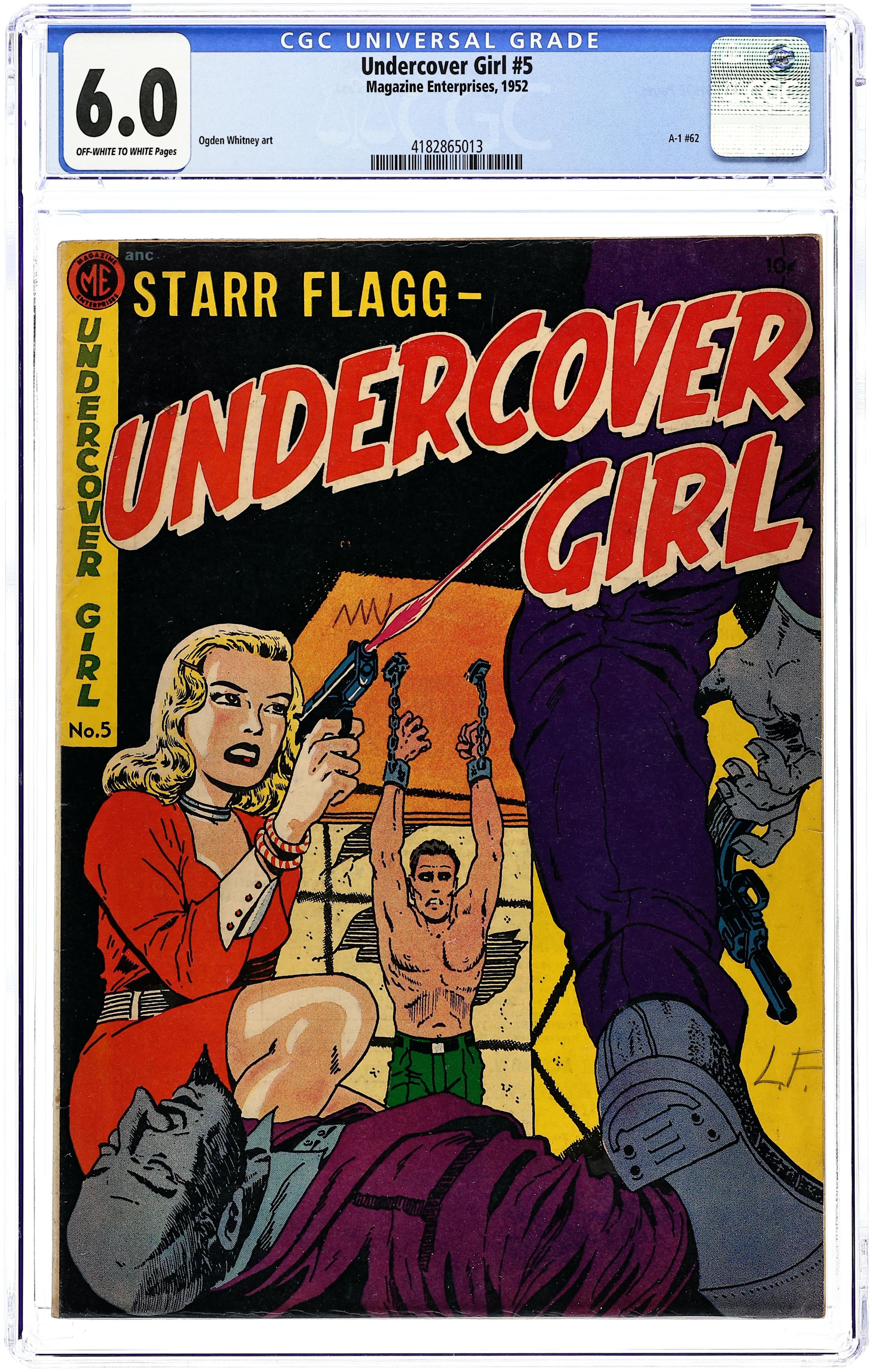 A-1 Comics #62. Stories by Gardner Fox. Art by Ogden Whitney. Sometimes listed as A1 Comics (1944 Life's Romances) #62. Female secret agent Starr Flagg debuted in Manhunt! (1947) before graduating to her own title. A reporter is murdered seconds before he could go on the air with a scoop about a hostile foreign country. Starr must find a ring that can trigger a nuclear holocaust. Madam Darkova's gorilla servant captures Starr and a scientist with a deadly steel-melting formula. The Mystery of the Stolen Secrets; The Riddle of the Radio-Death; The House That Hate Built; Jeopardy in Jade; Beauty and the Beast. 36 pages, Full Color. Cover price $0.10.