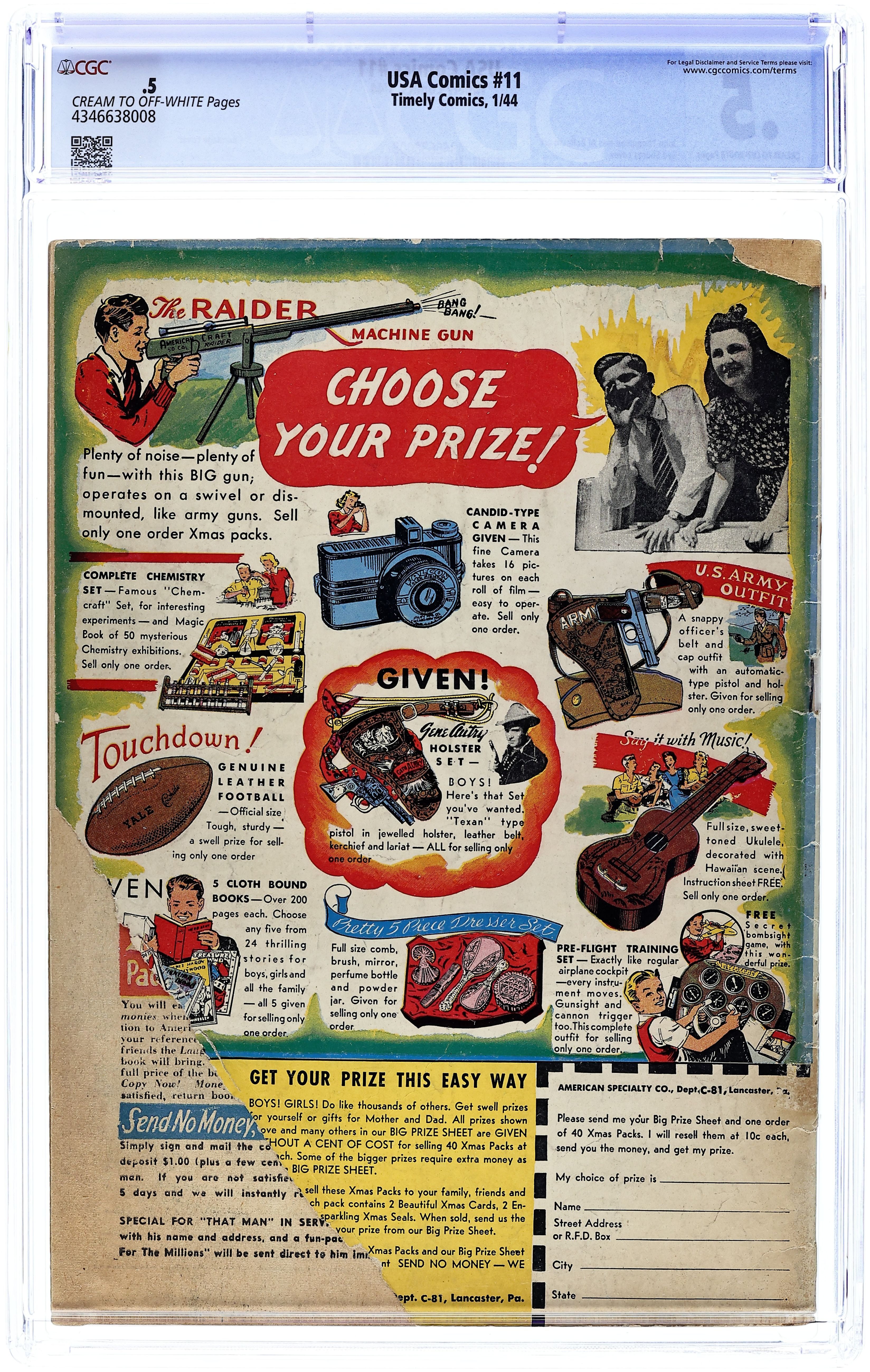 Cover by Bill Everett. Stories by Bill Everett, Nathaniel Nitkin, Edmund Ashe, Jr., Joseph Piazzo, John Daly, Jack A. Warren, Gilbert James, Paul Quinn, Harry Anderson, Harry Campbell, George Kapitan, Emil Gershwin, George Kapitan, Emil Gershwin, Laura Baker, and George Mandel. Super-hero stories of action, adventure and war, starring such characters as The Conqueror, Bomber Burns, and Sergeant Flagg. 68 pages, full color. $0.10. Cover price $0.10.