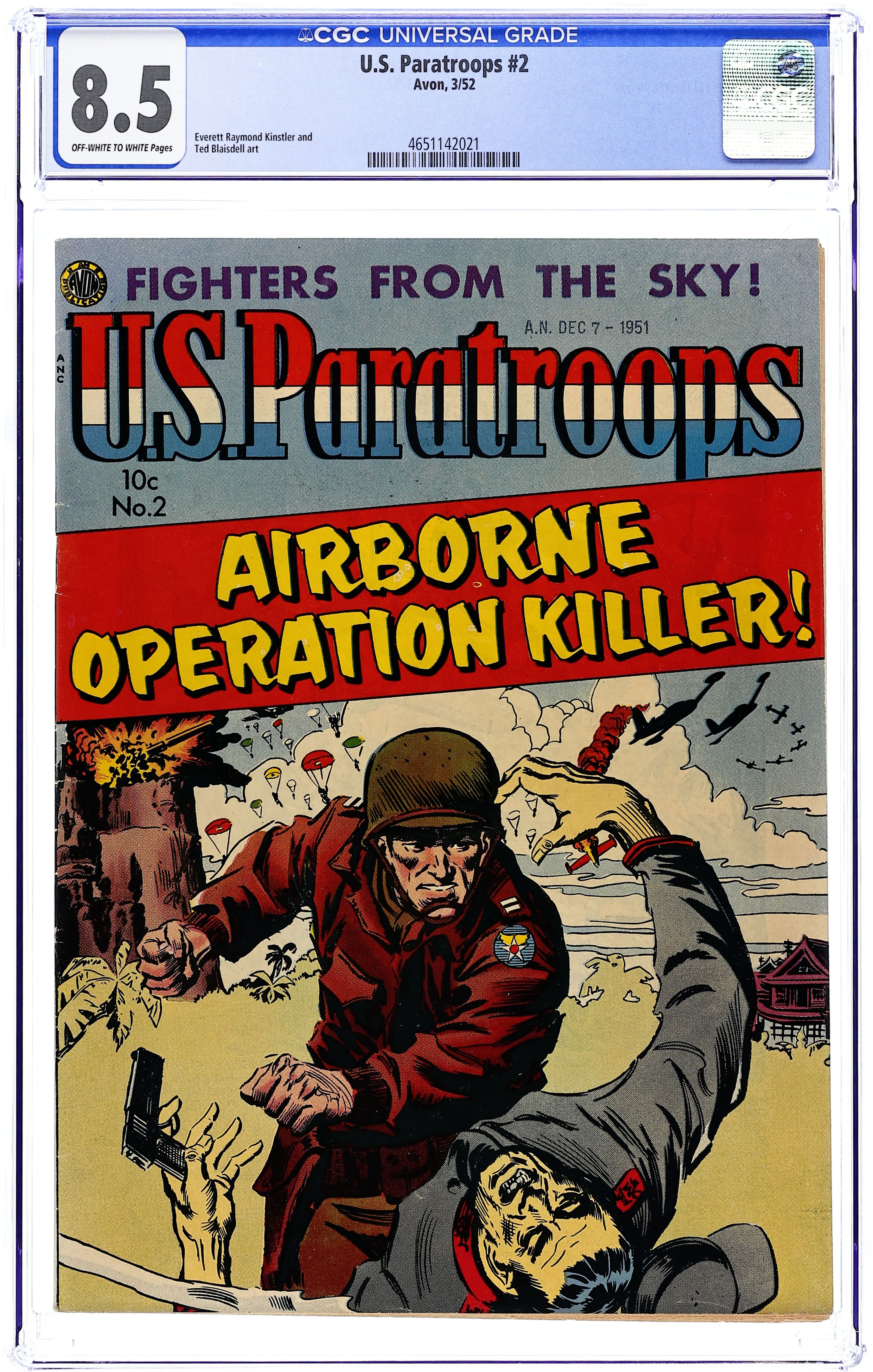 Art by Everett Raymond Kinstler, Tex Blaisdell and Mort Lawrence. One of many titles focusing on heroic American soldiers that came out as the Korean War was heating up. In a three-part story, U.S. Colonel Jeff Blane must undertake a dangerous mission within the Iron Triangle behind enemy lines, to secure secret plans for military operations that could mean thousands of casualties. Also featuring an action-packed contents page illustrated by Everett Raymond Kinstler on the inside front cover. Airborne Operation Killer!; The Boomerang Battery; Operation Death! 32 pages, Full Color. Cover price $0.10.