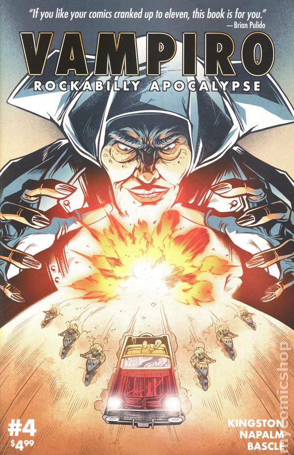 Written by Michael Kingston. Art and Cover by El Terrorifico Dr. Napalm. Cover by series artist El Terrorifico Dr. Napalm, who specializes in retro style poster art inspired by pop culture and cult classic icons. Every guitarist knows his name. His performances are the stuff of legend. He's played all over the world, but his face has never graced a single concert poster. He's never advertised. He just…appears! It's an action-packed duel in the desert! The Bonneville is out of commission and our heroes are pinned down by The Bad Habit…and the blazing desert sun! Can Estrella and Everitt hold off the shotgun-wielding Sisters of Mercy? Can Vamp survive an all-out war against Abaddon-- the Black Queen of the Abyss? And what role does The Monster Cop and his film school dropout nephew have to play in all of this? 32 pages, full color. Cover price $4.99.