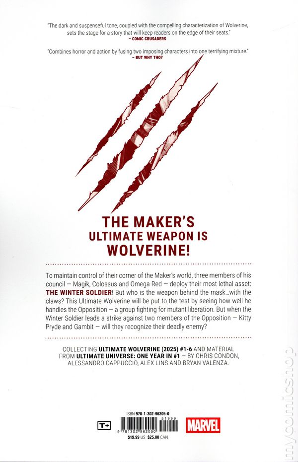 Volume 1 - 1st printing. "The Winter Soldier!" Collects Ultimate Wolverine (2025 Marvel) #1-6. Written by Christopher Condon. Art by Alessandro Cappuccio and Alex Lins. Cover by Alessandro Cappuccio. Ultimate Spider-Man, Ultimate Black Panther, Ultimate X-Men, the Ultimates and now finally Ultimate Wolverine is unleashed into the new universe as it reaches a pivotal turning point. THE ULTIMATE WINTER SOLDIER: WOLVERINE. To maintain control of their corner of the Maker's world, three members of his council - Magik, Colossus and Omega Red - deploy their most lethal asset: The Winter Soldier! But who is the weapon behind the mask...with the claws? This Ultimate Wolverine will be put to the test by seeing how well he handles the Opposition - a group fighting for mutant liberation. But when the Winter Soldier leads a strike against two members of the Opposition - Kitty Pryde and Gambit - will they recognize their deadly enemy? Softcover, 160 pages, full color. Rated T+ Cover price $19.99.