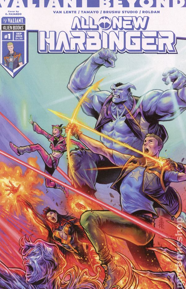 Written by Fred Van Lente. Art by Erik Tamayo. Cover by G. Fajardo. BECAUSE YOU DEMANDED IT: HARBINGER IS BACK! Designed as the ULTIMATE jumping-on point, the Valiant Beyond line of comics are ABSOLUTE must-reads that will ENERGIZE your love for superheroes! After the devastating fallout of the Harbinger Wars, humans and psiots are able to live together without conflict... but that doesn't mean that things are safe! Enter: Harbinger, a super team composed of uniquely powerful psiots including Archer, Flamingo, Alloy, and Crane, dedicated to protecting their city at any cost! When the terrorist Black Sheep takes a building hostage, it's up to Harbinger to step up and stop her. But are they up to the test after having recently lost one of their own? It's a trial by fire for Archer and the newest member of Harbinger in the first chapter of this can't-miss 3 issue story arc! A new era for Harbinger begins in a 28 page story from fan-favorite writer and Valiant mainstay Fred Van Lente (RESURGENCE) and artist Andres Ponce (PUNK MAMBO: The Punk Witch Project)! 28 pages, full color. Rated T+ Cover price $3.99.