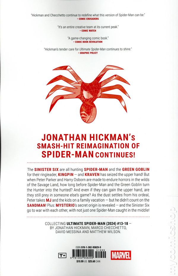 Volume 3 - 1st printing. "Family Business!" Collects Ultimate Spider-Man (2024 Marvel) #13-18. Written by Jonathan Hickman. Art by Marco Checchetto and David Messina. Cover by Marco Checchetto. Jonathan Hickmans smash-hit reimagination of Spider-Man continues! The Sinister Six are all hunting Spider-Man and the Green Goblin for their ringleader, Kingpin — and Kraven has seized the upper hand! But when Peter Parker and Harry Osborn are made to endure horrors at Kravens hands in the wilds of the Savage Land, how long before Spider-Man and the Green Goblin turn the Hunter into the hunted? And even if they can gain the upper hand, are they still prey in someone elses game? As the dust settles from his ordeal, Peter takes MJ and the kids on a family vacation — but he didnt count on the Sandman! Plus: Mysterios secret origin is revealed — and the Sinister Six go to war with each other, with not just one Spider-Man caught in the middle! Softcover, 152 pages, full color. Rated T Cover price $19.99.