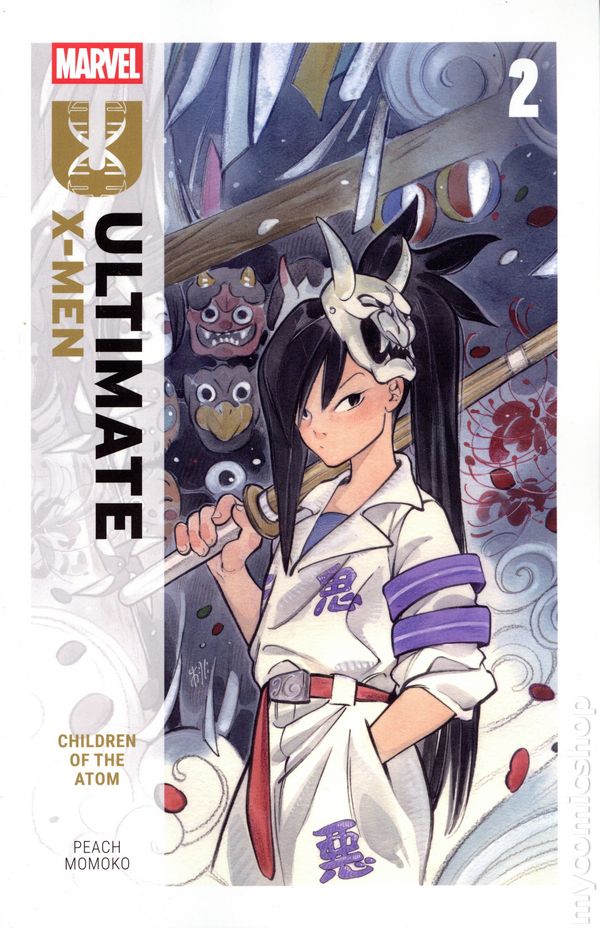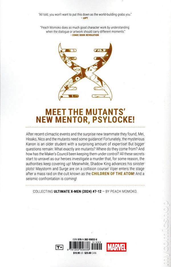 Volume 2 - 2nd and later printings. "Children of the Atom!" Collects Ultimate X-Men (2024 Marvel) #7-12. Story and art by Peach Momoko. Meet the mutants' new mentor, Psylocke! After recent climactic events and the surprise new teammate they found, Mei, Hisako, Nico and the mutants need some guidance! Fortunately, the mysterious Kanon is an older student with a surprising amount of expertise! But bigger questions remain: What exactly are mutants? Where do they come from? And how has the Maker's Council been keeping them under control? All these secrets start to unravel as our heroes investigate a murder that, for some reason, the authorities keep covering up! Meanwhile, Shadow King advances his sinister plots! Maystorm and Surge are on a collision course! Viper enters the stage after a mass raid on the cult known as the Children of the Atom! And a seismic confrontation is coming! Softcover, 144 pages, full color. Rated T+ Cover price $19.99.