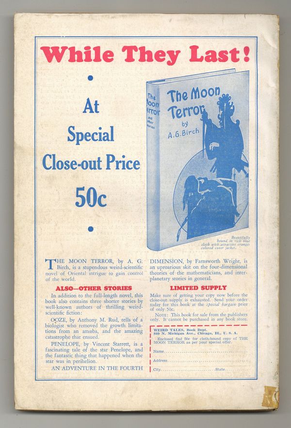 Published Feb 1939 by Weird Tales.$50.00- 3" cumulative spine split. Water damage. Oxidation.