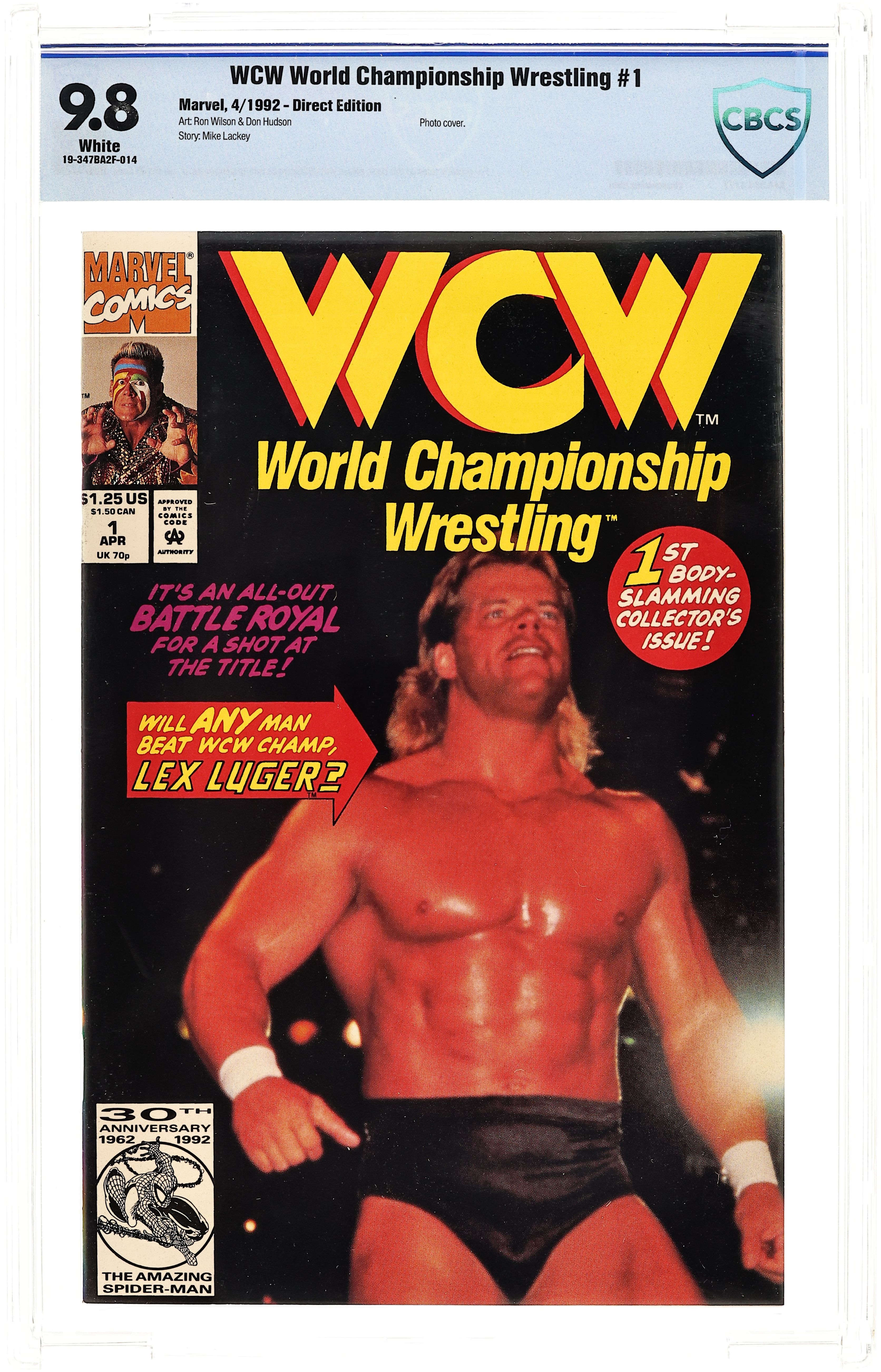 Direct Edition. It's an all-out "Battle Royal" for a shot at the title! Real life wrestling heroes and villains like Lex Luger, Sting and El Gigante come to Marvel in this new ongoing series. Written by (Marauder) Mike Lackey, with art by (Rampaging) Ron Wilson and (Dynamic) Don Hudson. Cover price $1.25.
