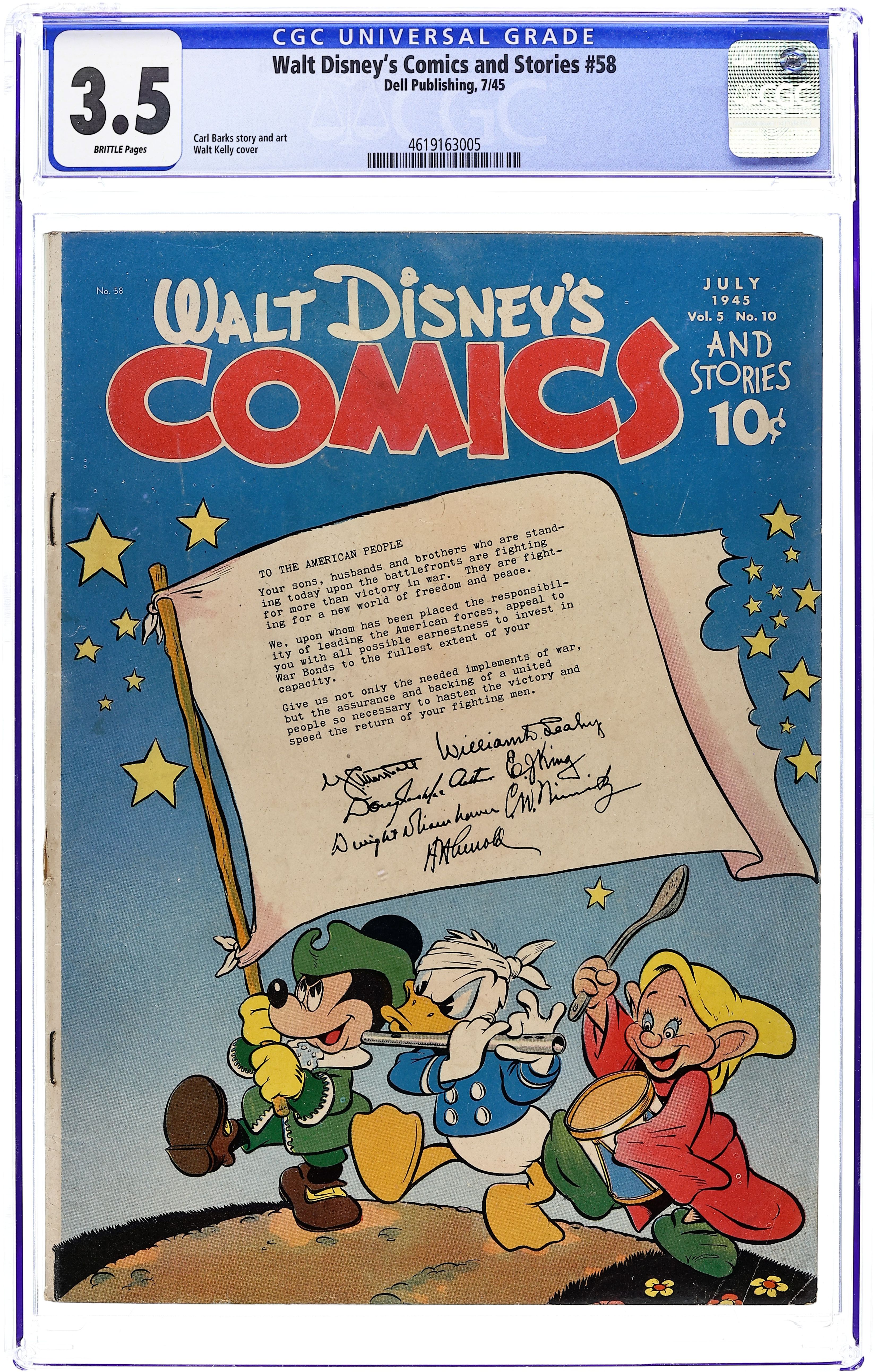 Cover by Walt Kelly. Stories and art by Carl Barks, Floyd Gottfredson, Dick Moores, Merrill De Maris, Bob Karp, Carl Buettner, George Waiss, Veve Risto, Roger Armstrong, Manuel Gonzales, Sylvia Holland, Bill Wright, and Al Taliaferro. Sometimes listed as Vol. 4 #10. The long-running vehicle for Disney character comics featured work by Carl Barks, Floyd Gottfredson, and Pogo's Walt Kelly. In a classic Floyd Gottfredson story from the Mickey Mouse comic strip, Mickey becomes the pilot of the experimental plane and finds himself over Nazi-held France. In a story by Barks, Donald competes with his nephews for news photos to sell to the local newspaper. In another story, Donald gets a mail-order penguin. Cover by Walt Kelly doubles as a PSA and features Donald Duck dressed as Uncle Sam, holding a WWII-era War Bond. Camera Crazy; Bucky Bug; Tiger Trouble; Mickey Mouse; Super Satisfaction; Here Comes the Iceman; Modern Design; A Car on the Time Plan; Shear the Wool!; Putt Out; Mickey Mouse: On a Secret Mission; Remote Control; Cold Treatment; Fowl Play; Labor Savers; Coals to Newcastle; Ducking Two Ducks Is No Duck Soup! 48 pages, Full Color. Cover price $0.10.