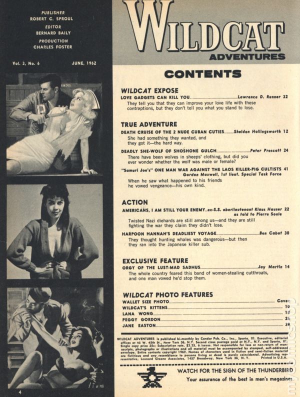 Vol. 6 #4 - July 1962. Men's interest magazine featuring adventure fiction, true life stories, and pictorials. In this issue: They've Built the Machine That Will Get Your Job; P.O.W. Ben Walker's One-Man War with the Nympho Torture Girls of Japanese "Camp Brutal"; and "Respectable" Wives Who Are Secret, Sex-for-Pay Tramps. Plus Special Extra-Length Section: two hot, new headaches for summer sportsmen - Campfire Call Girls and Small Boat "Bunkmates" (the great, indoor sin-doll race to vacation spots for outdoor men). 8 1/2-in. x 11-in., B&W. Cover price $0.25.