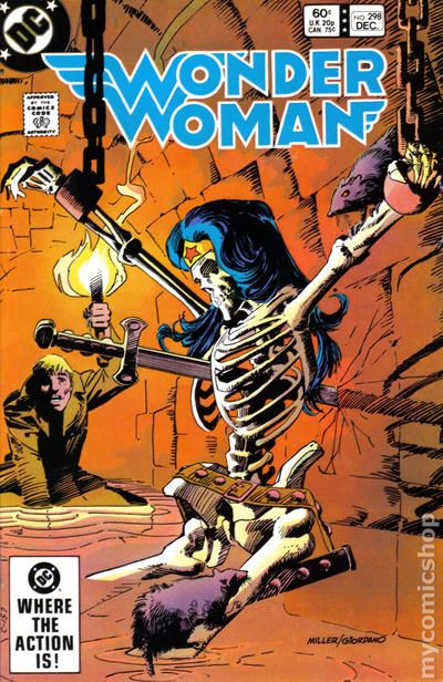 Newsstand Edition. Cover pencils by Frank Miller, inks by Dick Giordano. "Catacombs," script by Dan Mishkin, pencils by Gene Colan, inks by Frank McLaughlin; An ancient enemy of the Amazons seeks a cure for his ailments on Paradise Island, while a young terrorist receives guidance from the goddess Athena. "The Squeeze on Gotham!", script by Joey Cavalieri, pencils by Joe Staton, inks by Frank McLaughlin; Huntress trails the thugs who captured Blackwing back to their lair, only to find herself in a tight spot. 36 pages, Full Color. Cover price $0.60.